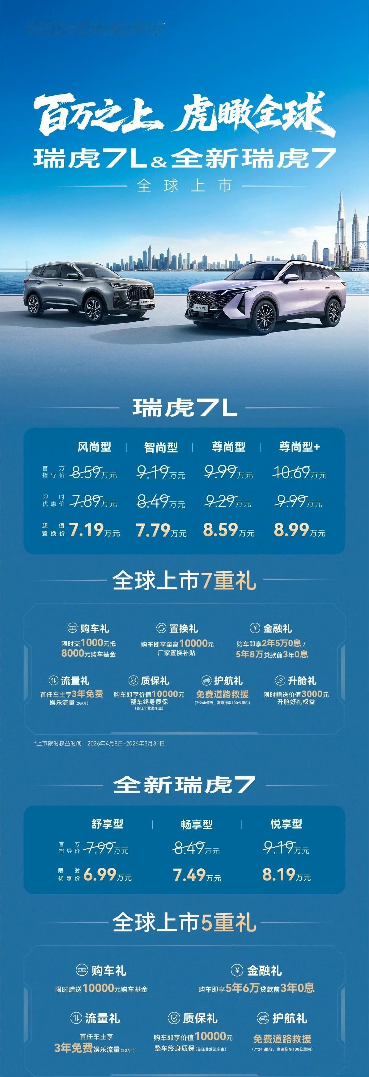 瑞虎7L官方指导价8.59万-10.69万元,限时优惠价7.89万起,置换低至7.19万,同步奉上7重上市豪礼;全新瑞虎7官方指导价7.99万-9.19万元,限时优惠价6.99万起,带来5重专属购车权益;瑞虎5运动版官方指导价7.99万-8.99万元,限时优惠7.09万起,置换低至6.79万。