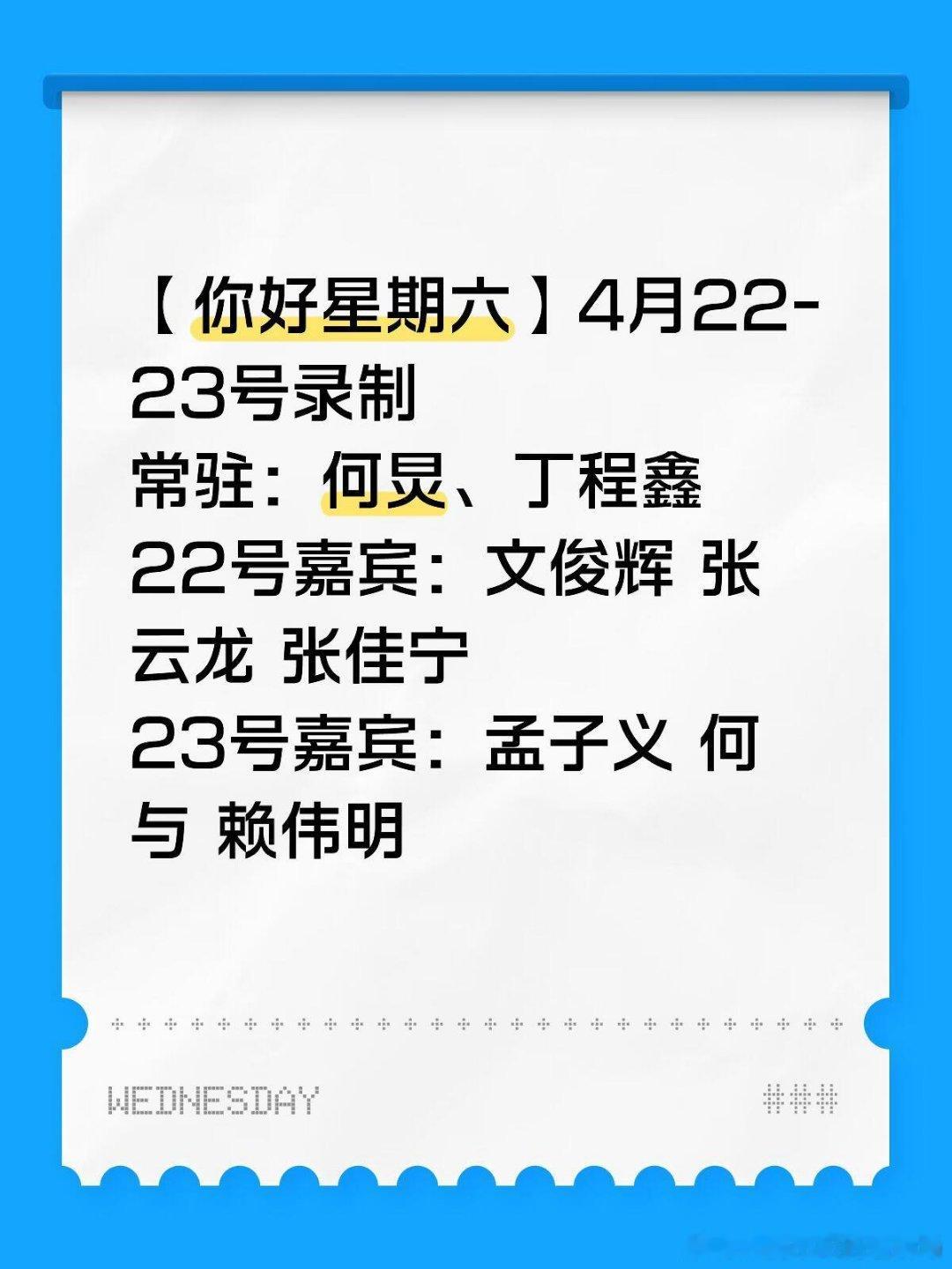 【你好星期六】4月22-23号录制常驻:何炅、丁程鑫22号嘉宾:文俊辉 张云龙 张佳宁23号嘉宾:孟子义 何与 赖伟明