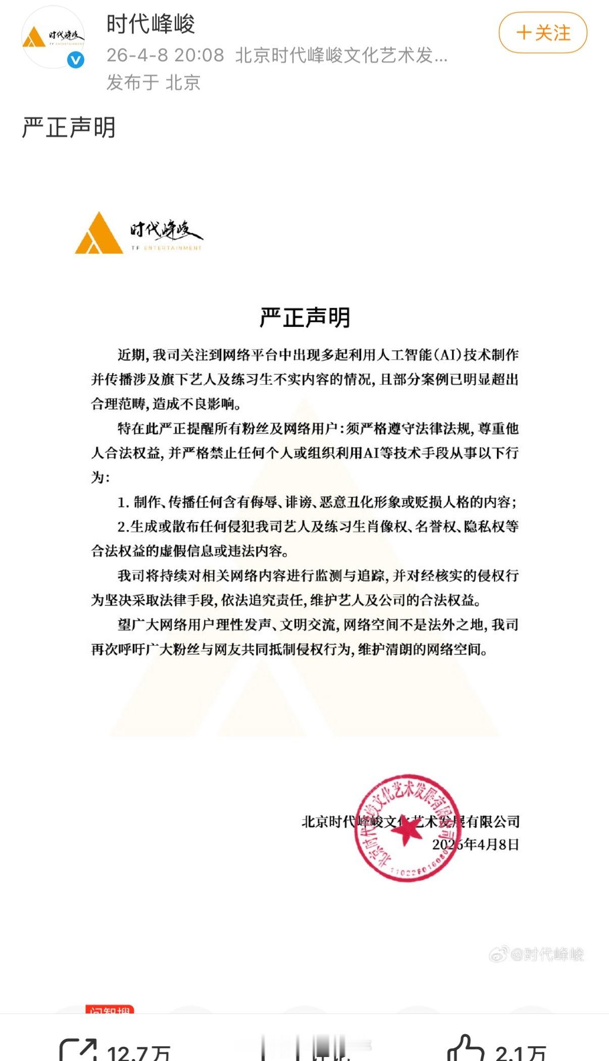 时代峰峻发声明抵制ai,这种合成的视频真挺讨厌的。
