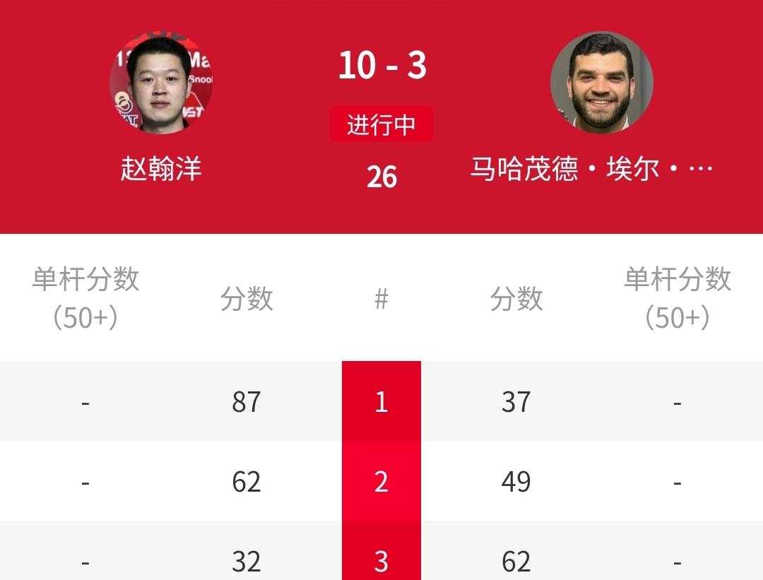 10-3,7-2,世锦赛资格赛:中国选手赵瀚洋大爆发!刚刚结束的2026斯诺克世锦赛资格赛,144进112轮次第二阶段的争夺中,中国选手赵瀚洋发挥非常出色,总比分10-3轻松战胜马哈茂德-埃尔-哈雷迪,强势晋级世锦赛资格赛第二轮。这场比赛第一阶段,赵瀚洋一开局就展开强大攻势,他取得7-2的巨大,晋级已经拿到九成希望。今天凌晨2:00开始的的第二阶段,赵瀚洋继续强势发力,他又打出一波3-1攻势,总比分10-3将将马哈茂德-埃尔-哈雷迪淘汰出局,祝贺赵瀚洋!赵心童 赵瀚洋