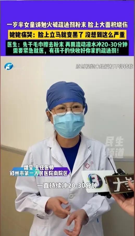 “悲剧还是发生了!”近日,河南郑州,一位宝妈永安管道疏通剂后,看着鞋柜高度还行,就随手把剩下的半包放在了上面。没想到,还是让女儿碰到了,脸上大面积被烧伤,瞬间就黑了,还不知道会不会留疤呢!网友:咋这不小心呢! 陈女士那天在家清理下水道,用了半包强碱性的管道疏通剂。剩下的半包,她想着鞋柜挺高的,孩子应该够不着,就随手放在了上面。就一转身的功夫,她一岁半的女儿碰到了那包粉末。 白色的粉末撒出来,扑在孩子脸上、身上。孩子当时就疼得大哭。陈女士吓坏了,抱起孩子就往医院跑。去医院的路上,她眼睁睁看着女儿脸上的皮肤开始变黑,一块一块的,像烧焦了一样。当地医院一看伤势太重,建议他们赶紧转去郑州的专业医院。 陈女士连夜带着孩子往郑州赶,一路上她看着孩子痛苦的样子,心里跟刀割一样。她不停责怪自己,怎么就那么随手一放呢?鞋柜再高,也防不住会爬会站的孩子啊。 管道疏通剂这东西,看着是白色粉末,其实杀伤力特别大。它里面主要成分是强碱,比如氢氧化钠。这东西遇到水,会发生剧烈的化学反应,放出大量的热。它碰到皮肤,不是简单的烫伤,是化学灼伤,会一直往皮肤深处腐蚀。 很多家长不知道,孩子误服或误碰后,第一反应是用水去冲、去漱口。这恰恰是最危险的做法。水会让强碱放热,造成二次伤害,灼伤更严重。正确的做法,是赶紧让孩子喝牛奶或蛋清。蛋白质能中和碱性,在黏膜上形成一层保护膜。 陈女士的孩子脸上大面积烧伤,以后会不会留疤,谁也不敢保证。就算疤痕能修复,孩子受的罪,妈妈心里的悔,是永远抹不掉的。这种痛,只有经历过的人才懂。 家里有小孩,真的不能有任何侥幸心理。你以为放得高就安全了?孩子会爬椅子、会垫脚。你以为就一会儿没事?危险往往就发生在那几十秒。像管道疏通剂、消毒液、洁厕灵这些带腐蚀性的东西,必须放在孩子绝对够不到的地方,最好是带锁的柜子。 用完了盖子马上拧紧,立刻放回原处。千万别图省事,随手放在桌边、鞋柜上。那些色彩鲜艳的瓶子,在孩子眼里可能就是新奇的玩具。他们不知道里面装的是危险。 照顾孩子眼睛真的不能离开,一个随手的小动作,可能换来一辈子的伤痛。希望陈女士的女儿能早日康复,也希望这样的悲剧,别再发生在任何一个家庭。 各位读者你们怎么看?欢迎在评论区讨论。