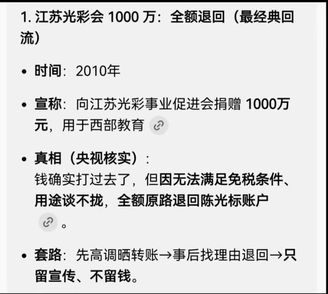 秃子总觉得别人的满头乌发是假发或者是移植的,矮子老喜欢看个头高的鞋底是不是增高鞋,满脸斑的女人总以为别的女人脸上都是涂粉的效果! 这高调做慈善的总觉得别人做慈善也是另有所图,所以参观人家医院后就没有下文了。要不是张雪将了一军,老陈肯定不会捐。但是捐了以后还是留了一个心眼,这款要专用! 截止到目前,李亚鹏的抖音都没有回应老陈的捐款,也就嫣然医院礼节性的感谢老陈的捐款!这和李亚鹏历来的做法很不相同。有懂的特别是许多律师都表示嫣然极有可能最后会把钱款退回去。 标哥能不能质疑?开口就骂人家凭什么质疑标哥的大概率都是容易成炮灰的。标哥做了这么多年高调慈善,多多少少确实捐了一点,但是和他所谓的几十亿肯定出入很大。前面什么什么地方有灾害,开口就是捐款几千万物资,有人质疑能有几十万就不错了!那么就会有人喷,人家好歹也是几十万,你又捐了什么? 所以吧,标哥是古今中外第一完人,无人能出其右!谁质疑标哥就是坏人!