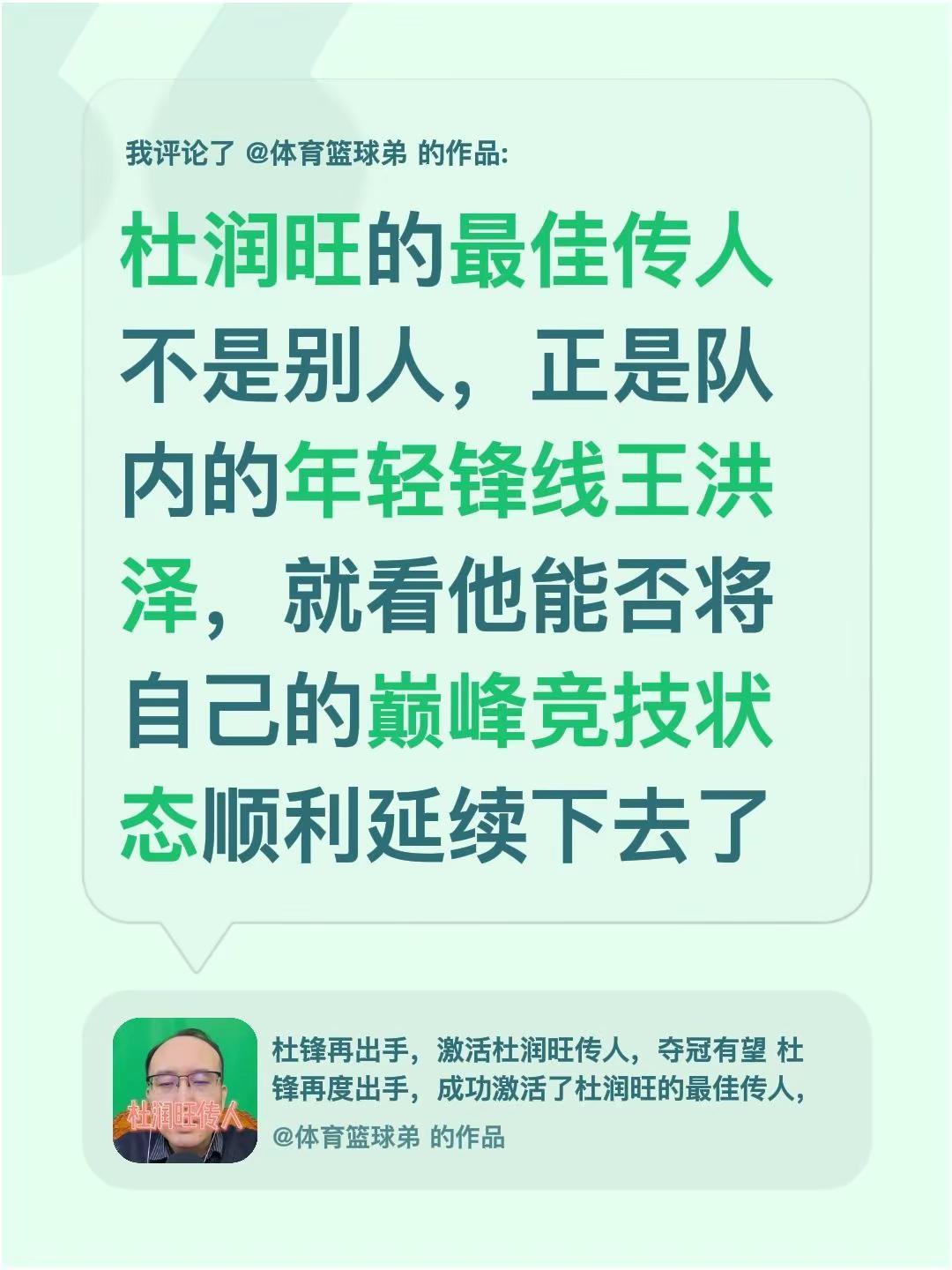 我评论了@体育篮球弟 的作品:杜润旺的最佳传人不是别人,正是队内的年轻锋线王洪泽,就看他能否将自己的巅峰竞技状态顺利延续下去了