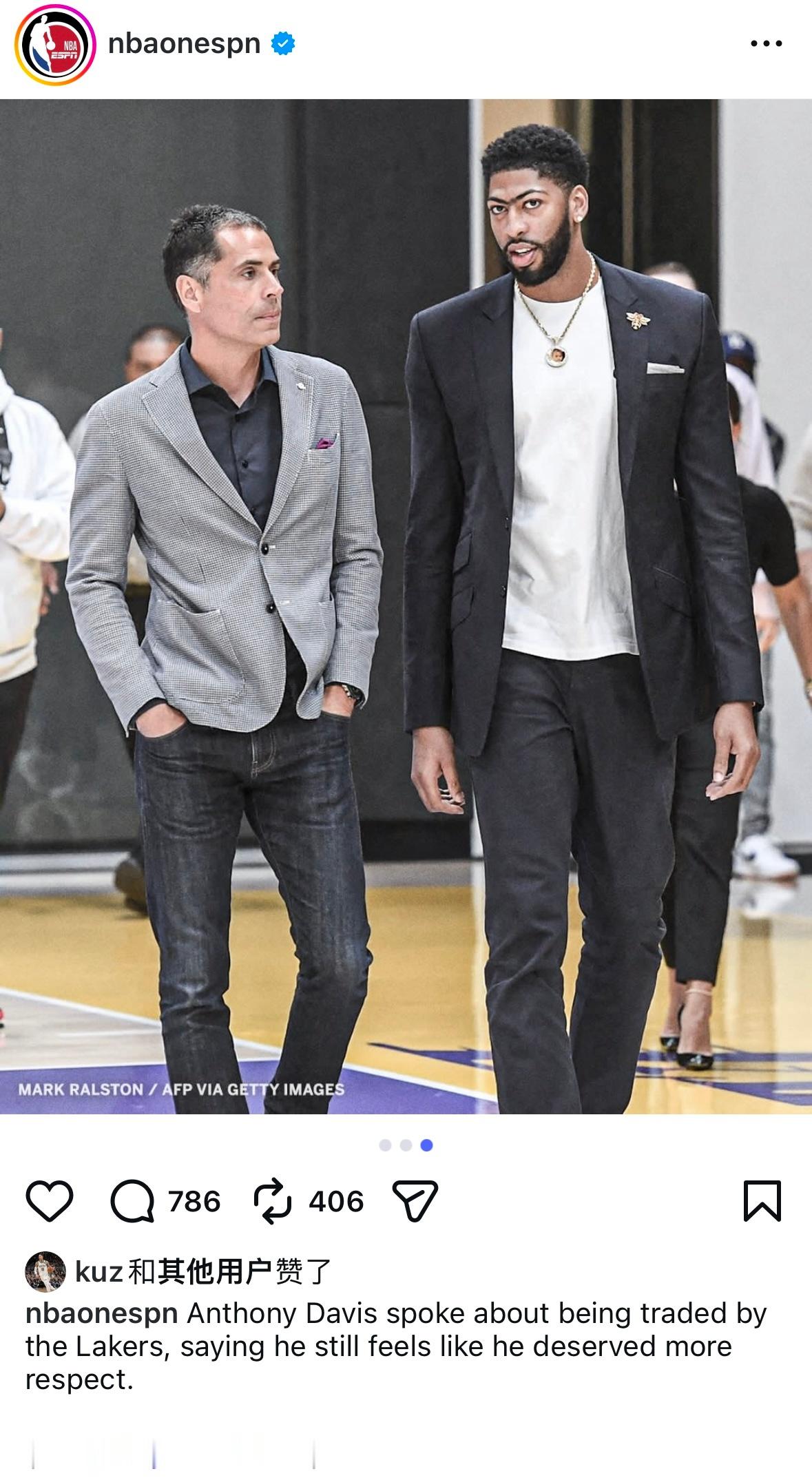 「安东尼-戴维斯谈及被湖人交易一事,称自己至今仍认为理应得到更多尊重,库兹马点赞」