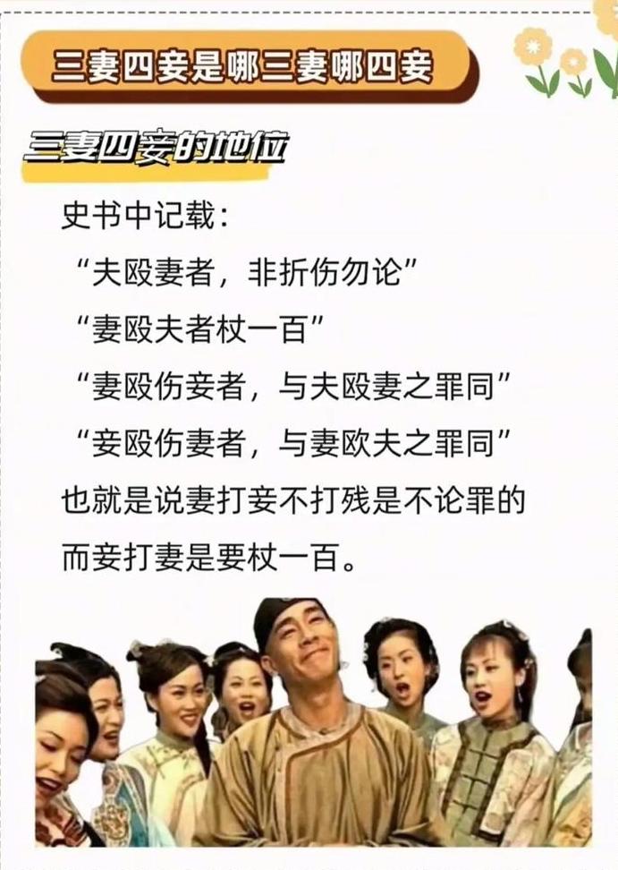古人常说——三妻四妾,三妻指的是哪三妻,四妾又指的哪四妾?她们地位如何?读完就明白了 “三妻四妾”在古代只是对妻妾成群的一种俗称,并不是说真的有三位妻子和四位小妾。从商周时期开始,中国实行的就是严格的 “一夫一妻多妾制” 。 三妻——最普遍的说法是“嫡妻、偏妻、下妻”,但这其中只有嫡妻(正妻) 是真正明媒正娶的女主人,而“偏妻”和“下妻”本质只是名头好听的高级小妾。 四妾——对应身份分别是贵妾、良妾、平妾、贱妾或贵妾、平妾、贱妾、侍妾,这只是根据出身和职能的划分,并非具体数量。 “三妻四妾”里的“三妻”和“四妾”并不是对地位平等的妻妾的统称,更像是一套等级森严的内部排名。其核心法则就是一句话:妻是“娶”来的主人,妾是“纳”来的财产,二者有云泥之别。 嫡妻 (正妻)地位至高无上,是整个家庭的“首席执行官”,她通过“三媒六聘”的仪式明媒正娶,所生子女为“嫡出”,享有优先继承权。 偏妻也叫下妻地位低于正妻(只在称呼上带个“妻”字),本质与妾无异,但比普通妾室高半级。其来源多为政治联姻或正妻陪嫁丫环。 贵妾是妾中地位最高,多为正妻随嫁的姐妹或贴身丫环(又称媵妾),是正妻的“自己人”。 良妾有一定保障,多为出身清白的平民女子,有正式纳妾文书,法律禁止随意买卖,但地位低于贵妾。 平妾是平平无奇,出身最普通,没有特殊背景,主要职责是延续香火。 贱妾地位最低,多为出身青楼、戏班的女子,常被视为生育工具,可以随意买卖。 侍妾也叫通房丫头,她们没有名分,地位仅高于普通奴婢,原是家中婢女,后被男主人收房,需随时侍奉主人及正妻。 说到底,这个“三妻四妾”制度是古代男权社会为维护家族等级、财产和血脉继承而构建的复杂体系,其本质是对女性的物化和压迫,与今天平等、尊重的婚姻价值观有着天壤之别。