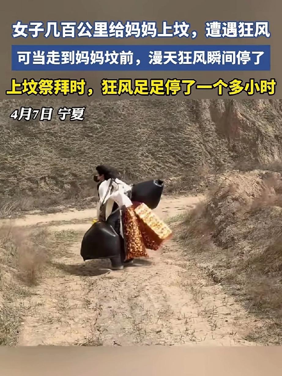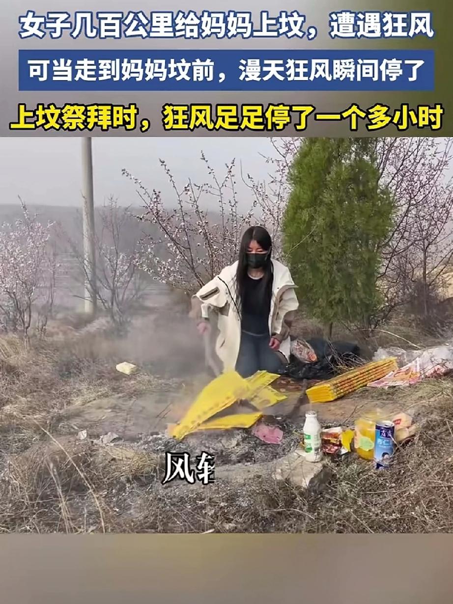 宁夏一女子几百公里给妈妈去上坟,路上遭遇狂风,当女子走到妈妈坟前,漫天狂风突然停了,祭拜时足足停了一个小时。母亲永远是孩子遮风挡雨的保护伞,即便不在了依然暗中“保护”女子烧了那么多纸钱给妈妈,一肚子的话也说给了妈妈听,也许有妈的地方就是家,哪怕是一堆黄土! 父母一旦离世随着时间的推移,也许接受了离别却抵估了思念!
