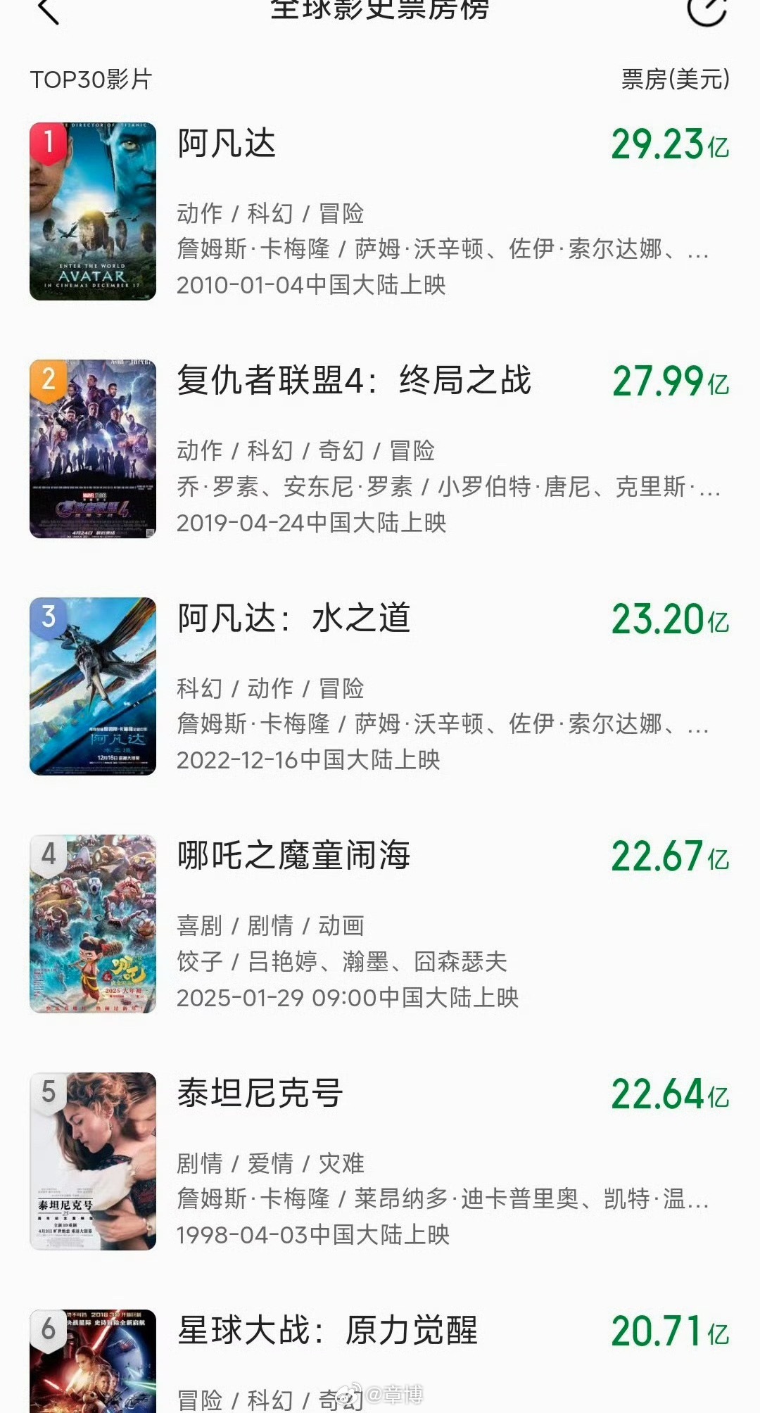哪吒2全球票房离第三不到一亿刚上映的时候,新年抽空就看了,现场确实是人挤人,但觉得影片质量还好,一点也不差,但是冲进全球排行榜前五,我是没想到的。