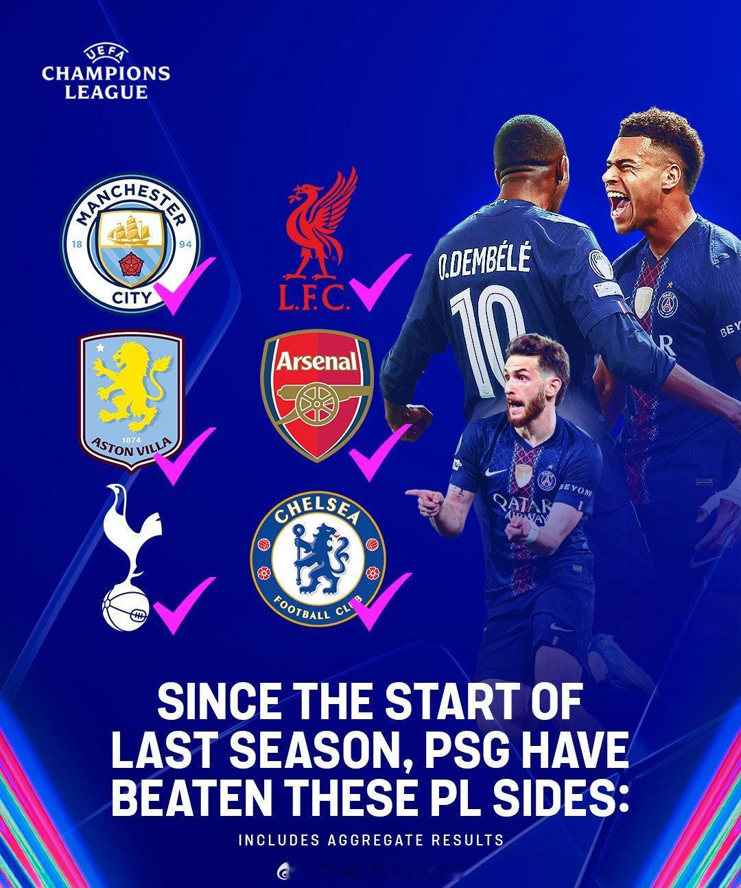 【巴黎成英超球队新克星】法甲豪门巴黎圣日耳曼,已经取代拜仁,成为英超球队的欧战新克星。从上赛季开始至今,大巴黎已经先后击败过曼城、利物浦、维拉、阿森纳、热刺、切尔西等英超强队。巴黎2比0利物浦 欧冠