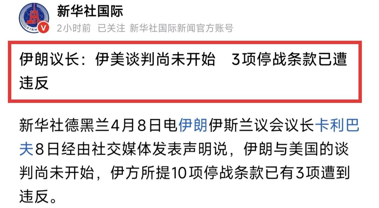 停火失败!这就是一场闹剧,在双方诉求几乎没有任何交集的情况下,开启停火和谈,根本不现实。 懂王昨天威胁称:任何向伊朗提供军事武器的国家,将被加征50%的关税,即刻生效且没有例外或豁免。 这摆明了就是要打第二轮的节奏:先堵住伊朗补充弹药的口子,然后自己这边,等布什号航母打击群和拳师号两栖打击群部署到位,2周后,随时可以开干。 美军参谋长联席会议主席凯恩,也明确表示:对伊朗的军事目标已经达成,停火只是一种暂时“中止”,美军仍时刻准备恢复战斗。 另外一边,以色列继续疯狂攻击黎巴嫩:昨天的轰炸规模,号称“对伊开战以来最大”,共造成89人死亡,722人受伤。 黎巴嫩真主党是“什叶派之弧”最重要的抵抗力量之一,你说伊朗怎么可能不管? 伊朗议长卡利巴夫发表声明:谈判尚未开始,已有3项停战条款遭到违反: 黎巴嫩停火,伊朗的要求是在各条战线全面停战,但以色列拒绝包括黎巴嫩。 不得侵犯伊朗领空,昨天一架无人机飞到了法尔斯省并被击落。 接受伊朗的浓缩铀活动,美方已经拒绝。 伊朗媒体报道:霍尔木兹海峡,再次完全关闭,通行的油轮被迫掉头返回;以后要过,也必须获得伊朗海军的批准,才能通行。 昨天革命卫队还发动了“真实承诺-4”第100轮攻击。 卫哥明确表示:敌人一向诡计多端,伊方不信任其任何承诺,将以更强硬的武力,回应任何侵略行为。 所以你说这有什么好谈的呢?大家都心知肚明,都知道对方在磨刀,准备2周后给对方致命一击,那还谈个什么劲呢? 伊朗需要明白:战场上得不到的东西,谈判桌上也别想得到。 伊朗想要安全保障,就必须靠自己打出来;想让美军撤离中东,就必须把他们打跑;想让以色列停火,就必须迫使他们不敢开火!