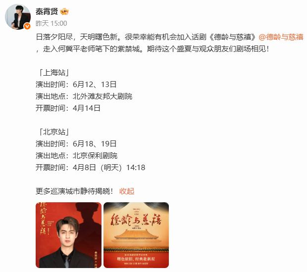 秦霄贤与江珊合作参演新话剧,事业又步入上升期!德云社秦霄贤发布了参演话剧《德龄与慈禧》的官宣海报和演出时间。在这部话剧中,秦霄贤将与江珊、郎玲合作,饰演小皇帝光绪。对于皇帝这一角色,秦霄贤是有经验的。在《瓦舍江湖》这部戏中,秦霄贤就饰演小皇帝黄半斤。话剧对演员的成长,演技的提升是非常有帮助的。自从《卿卿误我》巡演以来,秦霄贤在各方面都有了肉眼可见的变化。与之前纲丝节说自己遇到事业低谷期相比。如今,老秦各种邀约不断,事业慢慢地恢复,又开始步入上升期了。