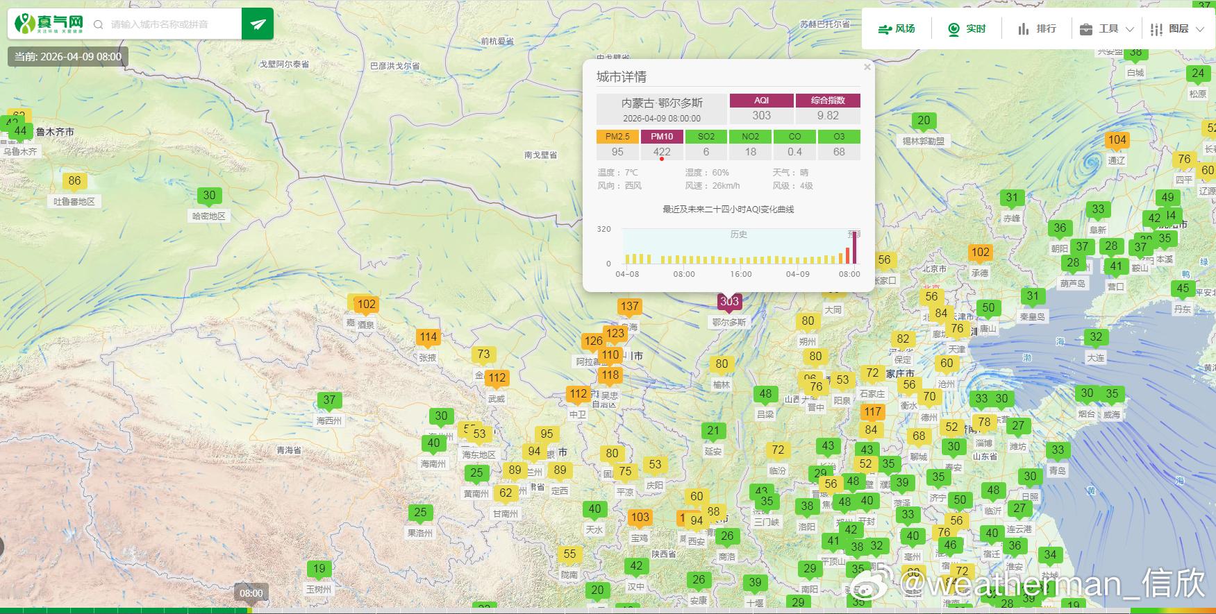 【雾和沙尘】今晨华北等地出现雨雾混杂的情况,8时能见度,安徽黄山26米、北京佛爷顶34米,雨雾交织;湖南保靖44米,出现特强浓雾。另外因为冷空气的大风影响,今晨内蒙古鄂尔多斯出现沙尘的严重污染,PM10大幅超标。