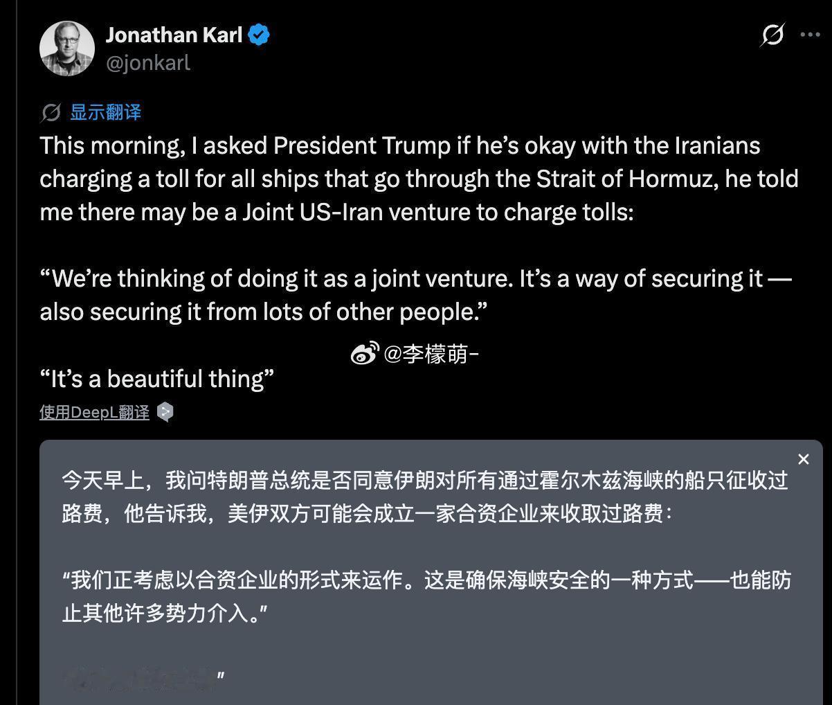 ABC资深记者透露,特朗普考虑美国与伊朗成立一家合资企业,来共同收取霍尔木兹海峡的过路费……
