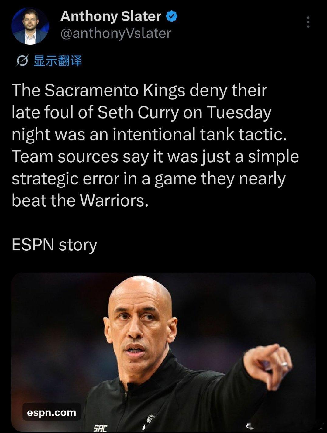 国王队否认昨天对阵勇士队塞思·库里最后时刻的犯规是故意摆烂战术。球队内部人士表示,这只是一个简单的战略失误,而他们在那场比赛中差点击败勇士队。