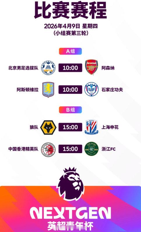 2026英超青年杯第三比赛日,小组赛收官战赛程,央视频有直播:北京男足选拔队vs阿森纳阿斯顿维拉vs石家庄功夫狼队vs上海申花中国香港精英队vs浙江FC 英超联赛 阿森纳著名教授