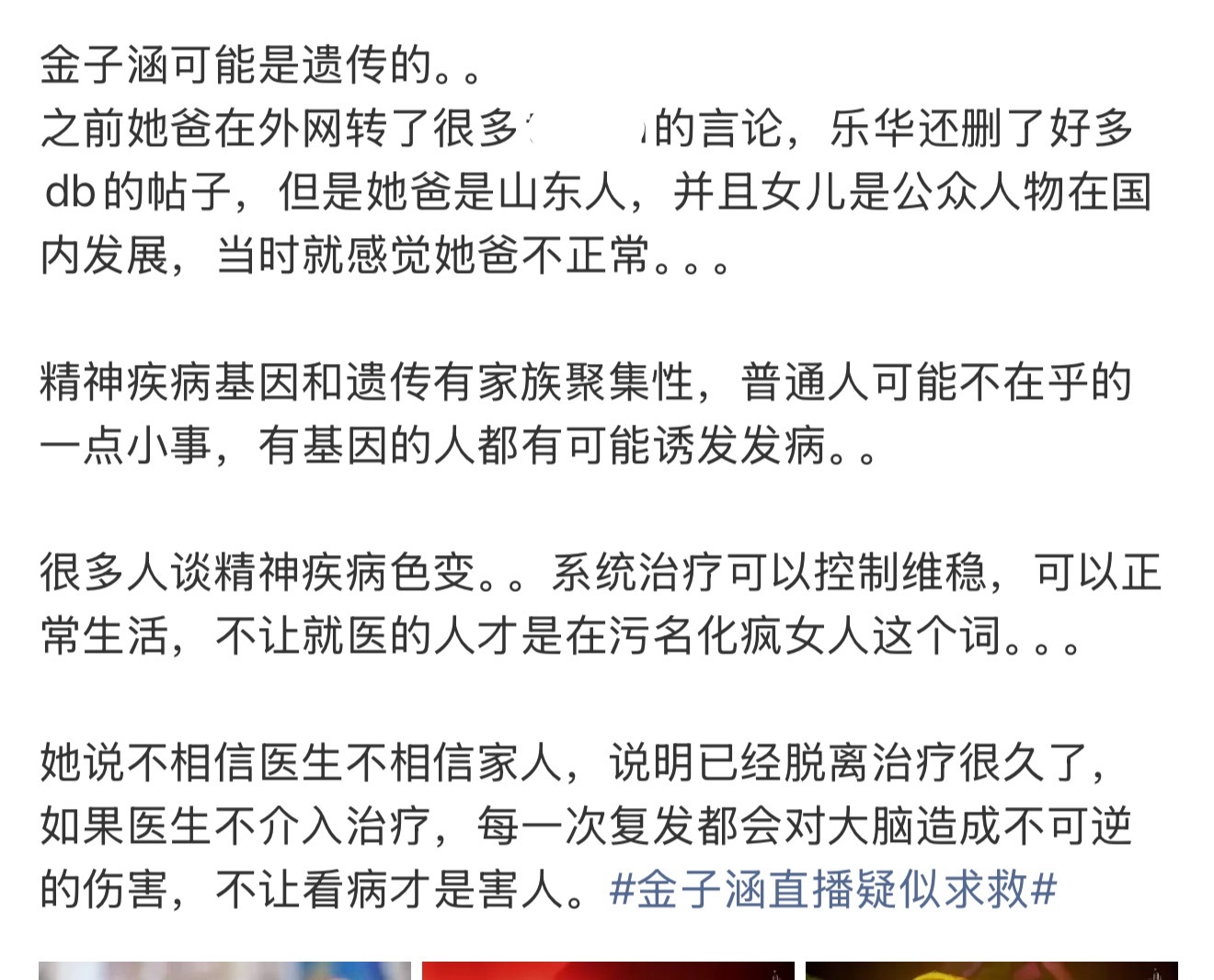 评论区还是有很多人觉得金子涵得了精神病,还有人提到她爸爸的言论,说她可能是遗传的