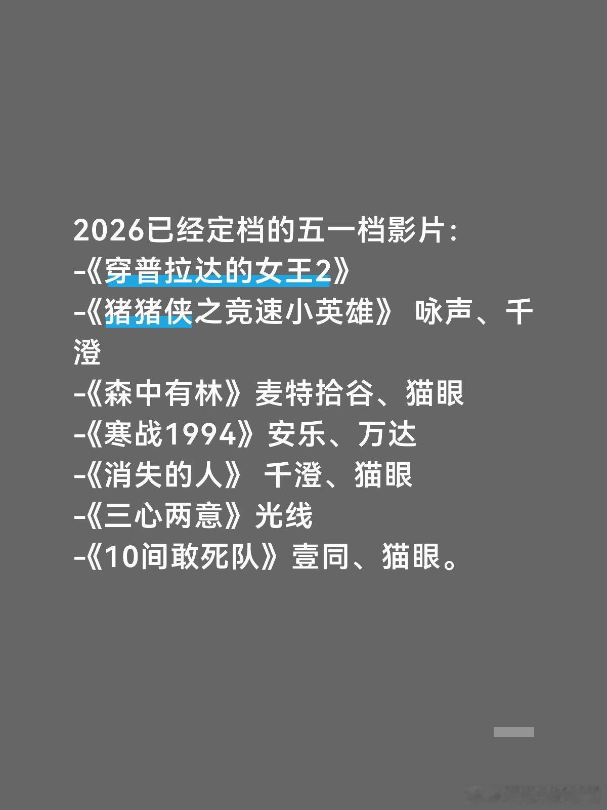 2026已经定档的五一档影片:-《穿普拉达的女王2》-《猪猪侠之竞速小英雄》 咏声、千澄-《森中有林》麦特拾谷、猫眼-《寒战1994》安乐、万达-《消失的人》 千澄、猫眼 -《三心两意》光线-《10间敢死队》壹同、猫眼。