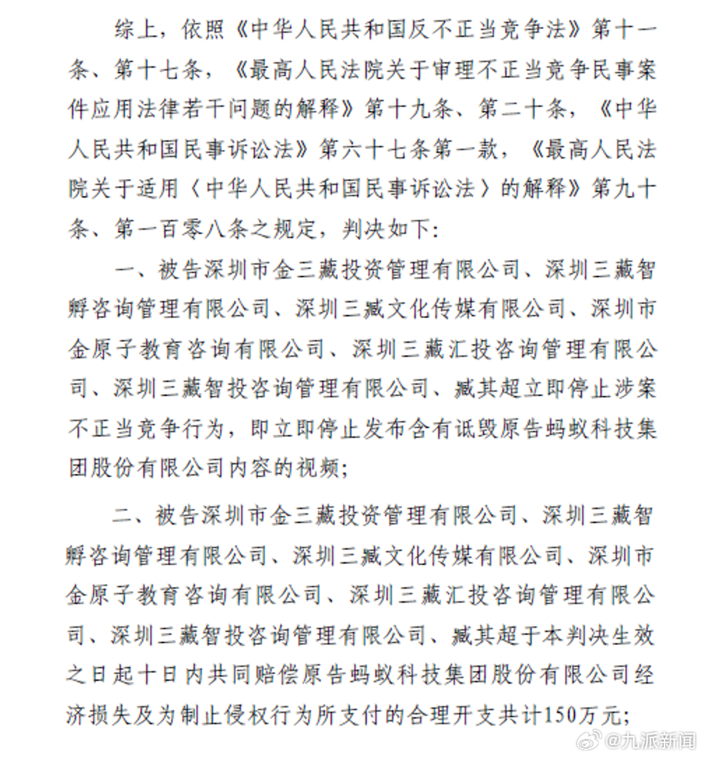 #粉丝超1亿自媒体诋毁蚂蚁集团#【#自媒体诋毁蚂蚁集团判赔150万#】以“专家”人设为包装,全网粉丝超1亿,通过运营500多个自媒体账号长期散布各类不实信息引流牟利的网络大V“臧其超”及其7家关联 MCN 机构被浙江省高级人民法院认定构成商业诋毁不正当竞争。日前,浙江省高级人民法院就蚂蚁科技集团股份有限公司(以下简称“蚂蚁集团”)诉深圳市金三藏投资管理有限公司、臧其超等七被告商业诋毁及不正当竞争纠纷一案作出终审判决,依法驳回被告上诉,维持原判,认定七被告构成商业诋毁,判令其立即停止全部侵权行为,并连带赔偿蚂蚁集团经济损失及为制止侵权所支付的合理开支共计150万元。