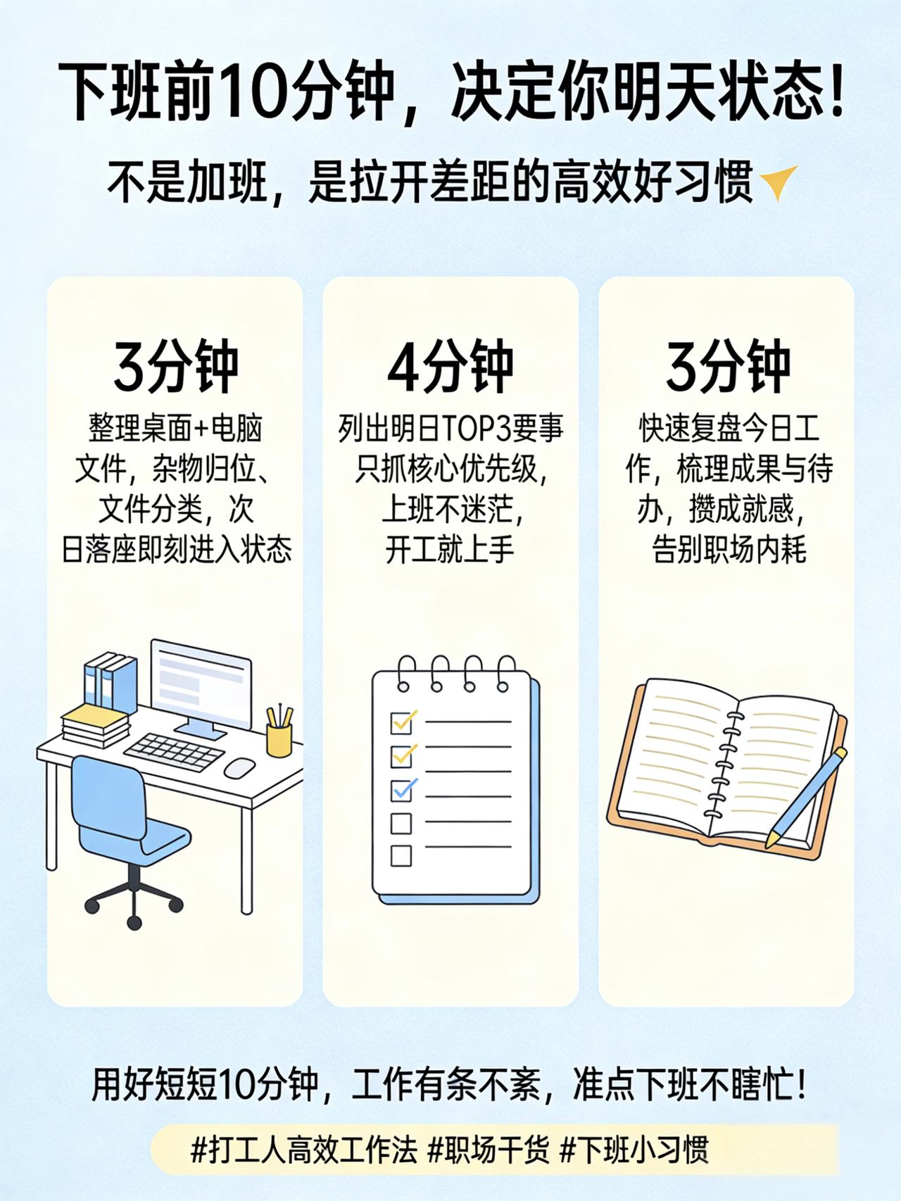 下班前10分钟别着急走!做好3件事,明天轻松开挂✨ 有没有发现,很多人一到下班点,立马手忙脚乱关电脑、拎包就冲,看似准时下班,结果第二天上班慌慌张张,找文件、理思路、忙半天都进不了工作状态,一天下来累且低效。 其实下班前最后10分钟,才是拉开工作差距的关键,这不是加班,而是让工作更轻松的高效小习惯,坚持下去,每天都能从容不迫! 给所有打工人分享3个必做小事,简单易坚持,第二天直接赢在开局: 1. 花3分钟整理桌面+电脑文件 把桌面杂物归位,没用的文件及时清理,重要资料归类放好。干净的工作环境,能让第二天一坐下就快速进入状态,再也不用对着乱糟糟的桌面心烦意乱。 2. 花4分钟列出明天最重要的3件事 不用列冗长清单,只挑最核心、最优先级的3件事,明确第二天的工作目标。上班后不用再花时间想“该做什么”,直接上手干活,效率直接翻倍。 3. 花3分钟快速回顾今日成果 简单复盘今天完成的工作、未解决的问题,心里有底的同时,也能给自己一点成就感,带着满满的踏实感结束一天,告别无效内耗。 别小看这短短10分钟,它帮你理清工作头绪、衔接好每日工作,告别手忙脚乱,既能高效完成工作,又能真正实现准点下班不加班。 打工人都快学起来,把这10分钟利用好,让每天的工作都有条不紊,越干越轻松!下班后该做什么 下班规则