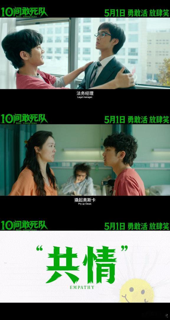 陈思诚新片10间敢死队定档5月1日上映!《10间敢死队》用喜剧方式诠释生死议题,不沉重、不刻意,在轻松氛围中传递生命力量。当绝望遇上希望,冷漠被温柔融化,最终收获勇敢活下去的信念,影片获天坛奖入围认可。
