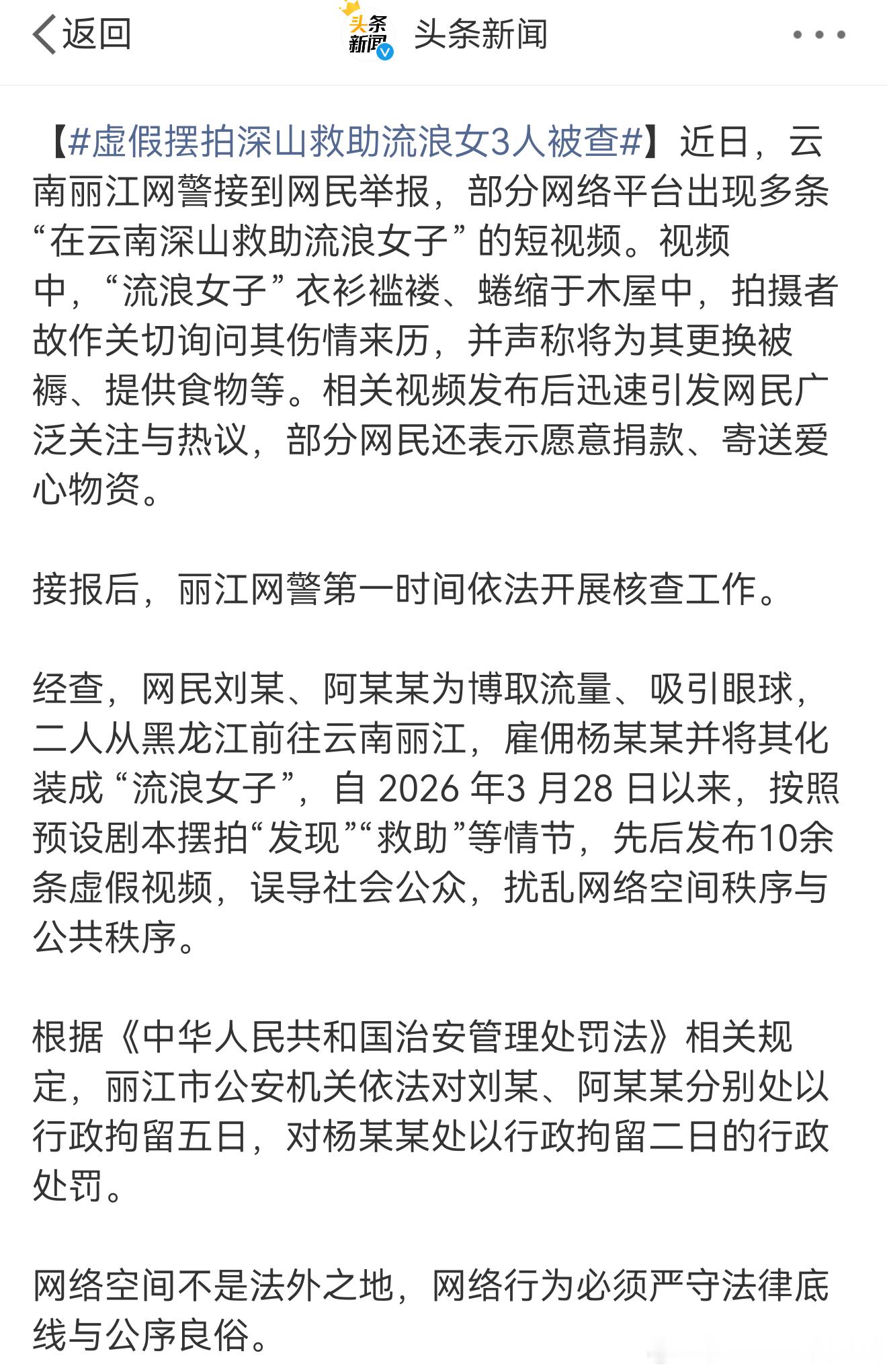 虚假摆拍深山救助流浪女3人被查典型好吃懒做,想赚网络钱!建议严惩!