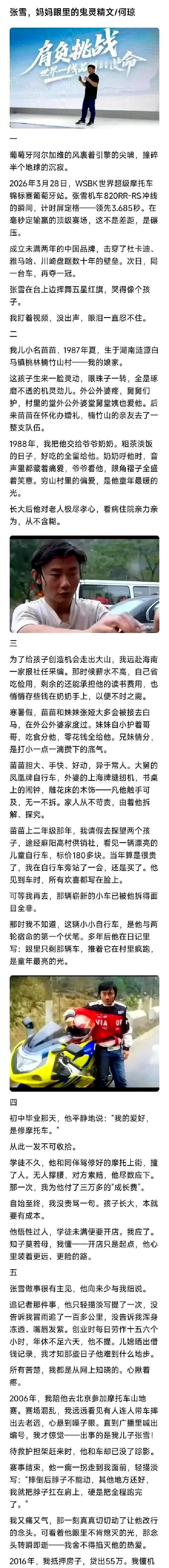儿子拿了世界冠军,妈才出来说话? 国产机车老板张雪,最近在葡萄牙夺冠,破了欧美日垄断,火得一塌糊涂!他妈何琼,一个厦大毕业的作家,立马发长文回忆儿子,说当年怎么支持他。 有网友就翻旧账了,说张雪早年吃苦、一个人在赛道拼的时候,妈咋没动静?现在成功了,才跑出来高调认亲,是不是太现实了点! 但人亲妈确实掏钱了。学徒时撞人赔了三万多,创业时直接抵押房子给了55万!这笔钱,他老婆也出来证实了。 现在一家人在重庆团聚了。这事儿,你怎么看?