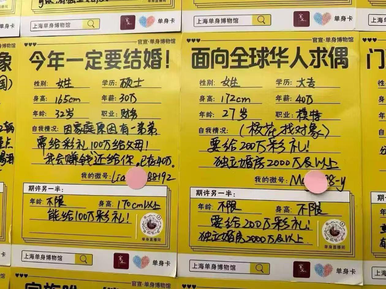 到底什么人,会当这种天价彩礼的冤大头? 很多人刷到上海相亲角这两张征婚卡,第一反应都是:谁会傻到掏 100 万、200 万彩礼,当这个冤大头? 但现实是,真有人会,而且精准踩中了几个死穴。 第一类:被催婚逼到绝境的大龄男青年 尤其是 28-35 岁、农村或工薪家庭出身的,父母天天催、亲戚天天问,在婚恋市场里没什么选择权。他们最怕的不是花钱,是 “娶不上媳妇”,哪怕条件离谱,也愿意赌一把:万一成了呢?河南就有个 30 多岁的大哥,相亲 3 天就给了 16 万彩礼,结果领证没几天新娘就跑了,一辈子的积蓄打了水漂。 第二类:被 “画饼” 冲昏头的老实人 就像这张卡上写的 “我有 400 万,会还钱给你”,专门骗那种心软、好说话的老实人。他们总觉得 “人家都这么说了,肯定不会骗我”,把空头承诺当保障,把对方的吸血要求当成 “结婚的诚意”,最后钱掏了,人没了,打官司都难要回。 第三类:想靠婚姻 “一步登天” 的投机者 别以为只有女方想捞钱,有些男方也抱着侥幸:花 200 万彩礼,娶个 “校花模特”,既能满足虚荣心,又能靠女方资源往上走。可他们忘了,真正条件好的姑娘,根本不会把婚姻当成买卖,张口就要天价彩礼的,本质就是把你当成提款机。 第四类:被父母裹挟的 “妈宝男” 很多时候不是男方想给,是父母逼着给。老一辈觉得 “彩礼给够了,媳妇才会好好过日子”,为了抱孙子,掏空养老钱、借高利贷都愿意,最后把小两口的婚姻变成了债务枷锁,没过两年就离婚,全家跟着遭殃。 说白了,冤大头从来不是 “傻”,是被 “结婚” 这两个字绑架了。婚姻从来不是买卖,更不是扶贫,你掏的不是彩礼,是一辈子的隐患。遇到这种张口就要百万彩礼、只谈索取不谈付出的,直接拉黑,别当那个被割的韭菜!