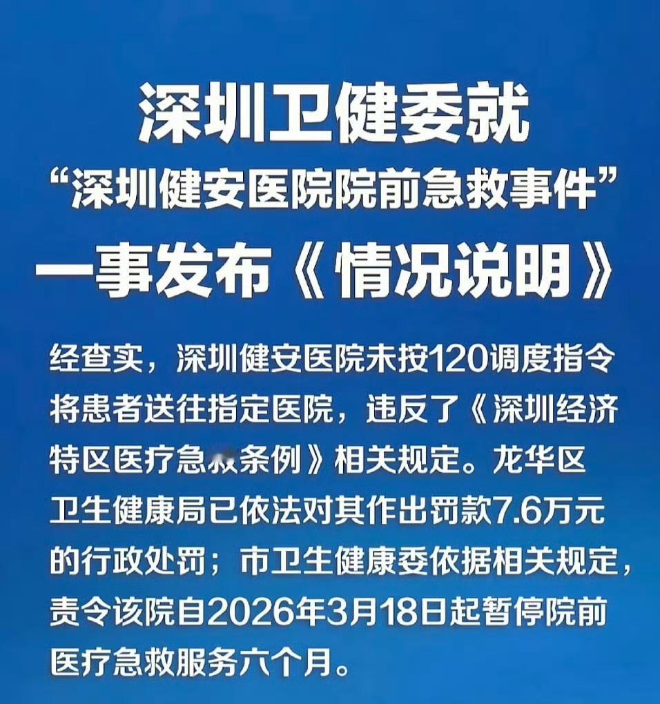 深圳一辆救护车为了拉生意,居然违反指令把病人拉去自家医院,最后延误抢救导致患者离世,官方通报刚出来。 事情起因有位阿姨突发腹痛,家属急得不行赶紧打了120,调度中心明明指令把人送到龙华区人民医院,结果救护车直接把人拉去了所属的健安医院,家属当时就急了,反复要求转院,可医院一直磨磨蹭蹭,等好不容易转到指定医院时,阿姨已经休克昏迷,最后抢救无效走了,更气人的是,这医院不止干了一次这种事,之前还有另一位患者也被他们违规截留过。 深圳卫健委最近通报了处理结果,直接罚了这家医院7.6万元,还暂停他们半年的院前急救服务资格,网友们觉得这惩罚太轻了,毕竟一条人命就这么没了,光罚点钱停半年服务,根本不足以平民愤。还有人扒出,这家健安医院的急救站2020年就启用了,没想到背地里干这种丧良心的事。 现在家属已经把医院告了,法院也委托了机构做医疗损害鉴定,后续会根据结果处理,深圳卫健委也说要在全市查一遍所有急救单位,还得优化调度系统,以后要盯着救护车的整个行驶路线,绝不能再让这种事发生。 想想真的后怕,120是救命的车,结果成了某些医院赚钱的工具,要是以后大家遇到紧急情况,连救护车都不能信了,那该怎么办?希望这次能给所有医院敲个警钟,救命的事容不得半点私心。深圳急救事件 民营救护车乱象 违规使用救护车 深圳通报救护车截单延误抢救致死 热点 事件来源:北京日报