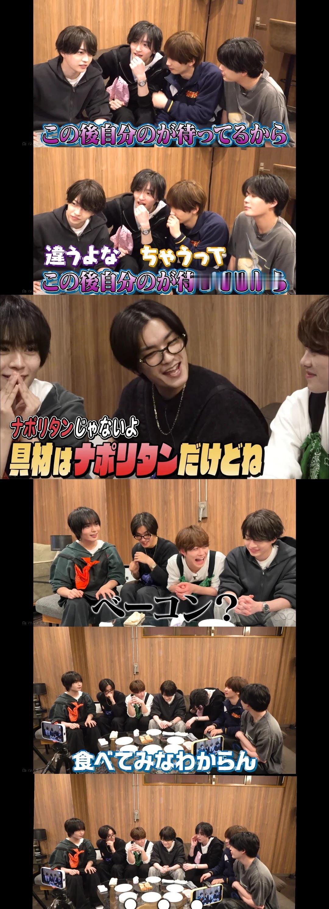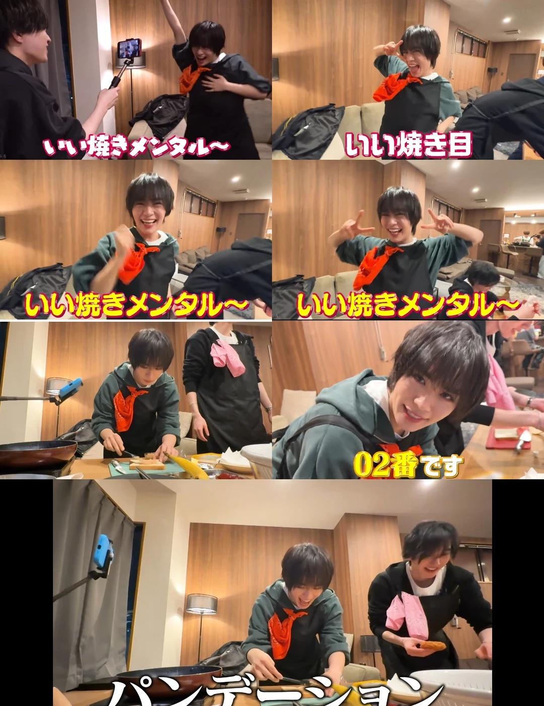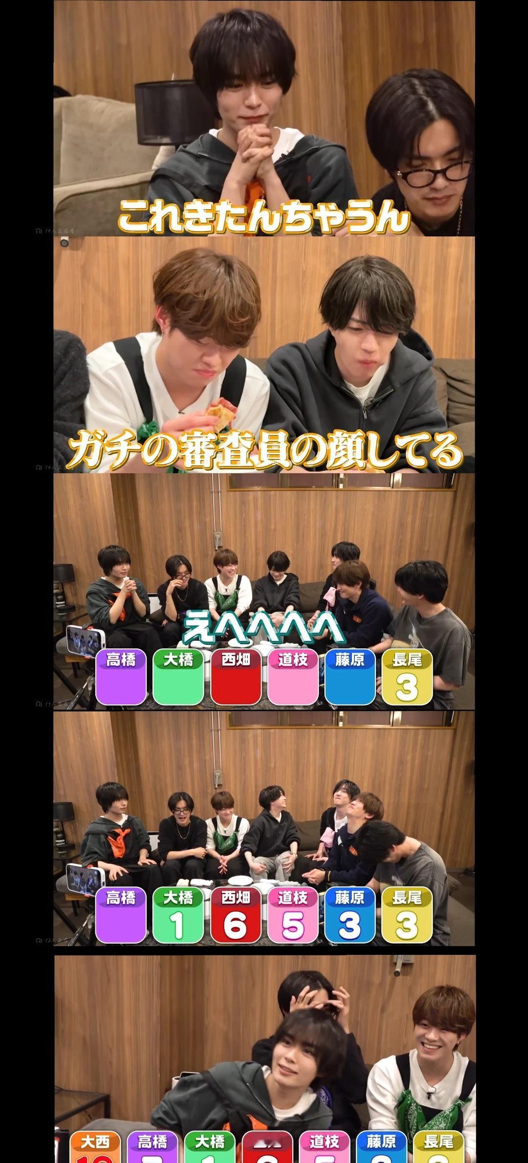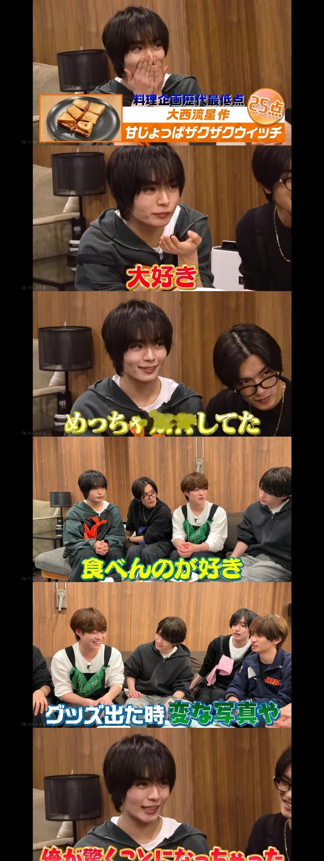 果然萌萌的我只适合萌萌 家里有一个人会做饭就行了 感觉是有点打击到流星了 宣布分数之后情绪特别低落 (可是他总是做出黑暗料理啊) 咱们下次只吃就好了 —— 这期每个人状态特别好 真的很好笑 大西畑之后是粉橙 然后又是珍奶 特别可爱 —— DJ大吾再次返场hhhh 特别好笑 什么时候再拍一次 本来kenken吃香蕉没什么的 丈给来一句以为是猴子在拿着摄像机hhhhh kenken手上是套了个蔬菜的保护套吗? 依旧在看棒球⚾ 还没关掉电视吗? —— 虽然小流受到打击 大家受到味蕾冲击 但是真的很好笑 听到放了培根之后这个桥感觉要笑出来了 没一个人敢上手拿 丈:谷子丑照警告⚠️ 是真的受到打击了 状态特别像早期攀岩不成功的样子 感觉下一秒要哭出来了 没事的小流 我们只吃现成的就好 大吾安慰小流 下次做流星擅长的 大吾就是这样很让人心暖 恭平就这样一直在拍拍流星 今天恭流也是绝赞互动 桥啊 开头还能摸摸流星 结束了今天看都不看你 罚你给流星做十天饭 大西流星 なにわ男子