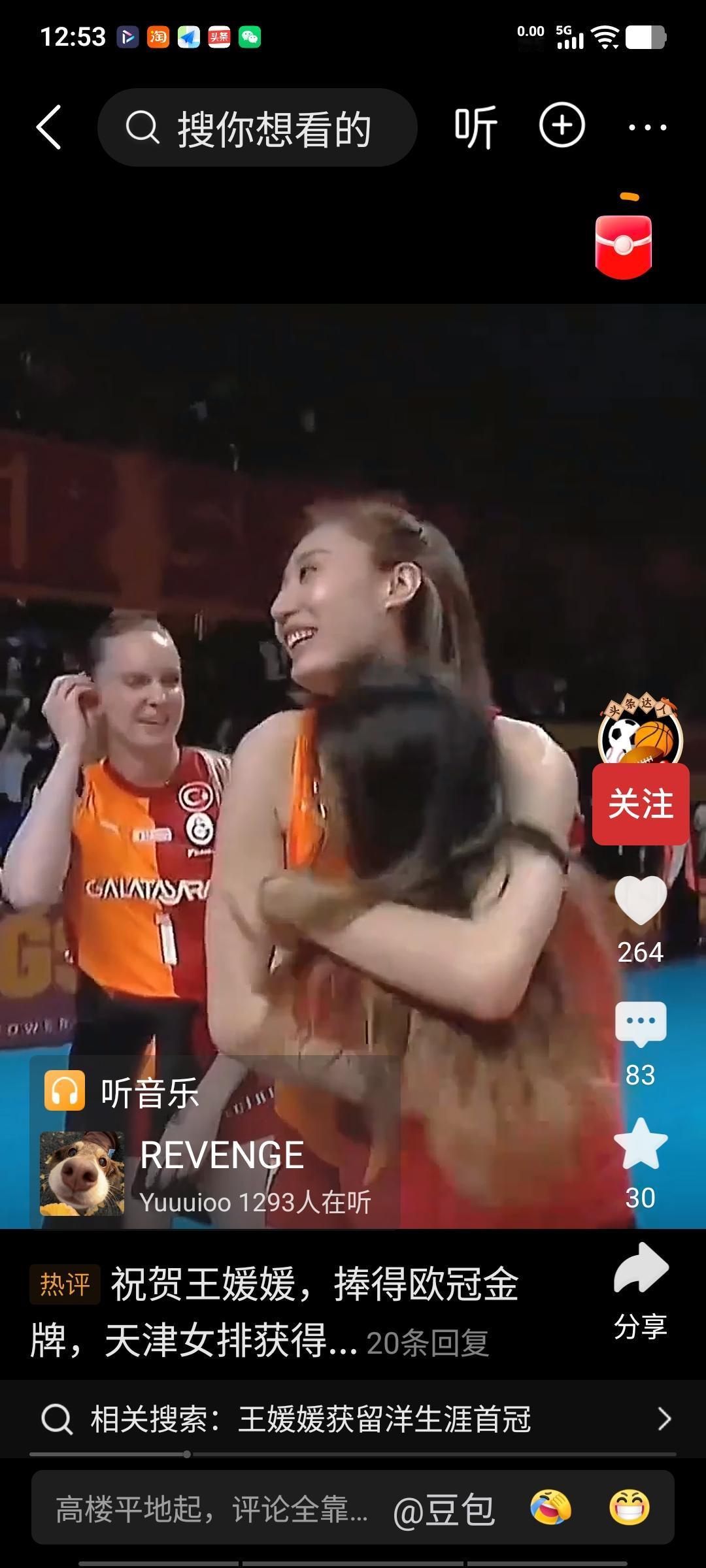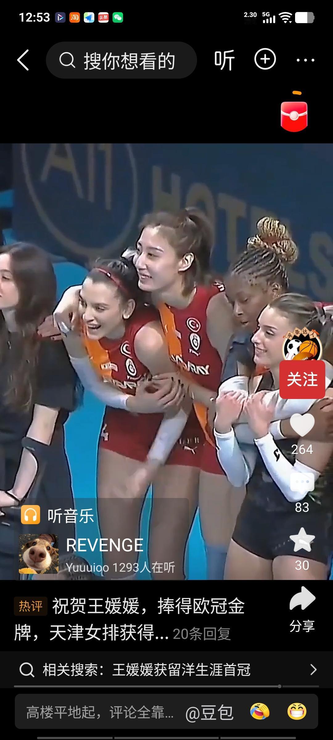 王媛媛所在的土耳其加拉塔萨雷队主场3比1战胜意大利基耶里队,斩获队史首个欧联杯冠军。王媛媛首发登场,取得11分,为夺冠作出重大贡献,赛后王媛媛欣喜若狂,同队友合影留念,王媛媛这次留洋的经历,非常成功,即锻练了自己,又感受了欧洲队的比赛强度,受益匪浅,估计回国后,国家队应有她的一席之地,这也是中国队员继朱婷后,又一成功范例,恭喜王媛媛。