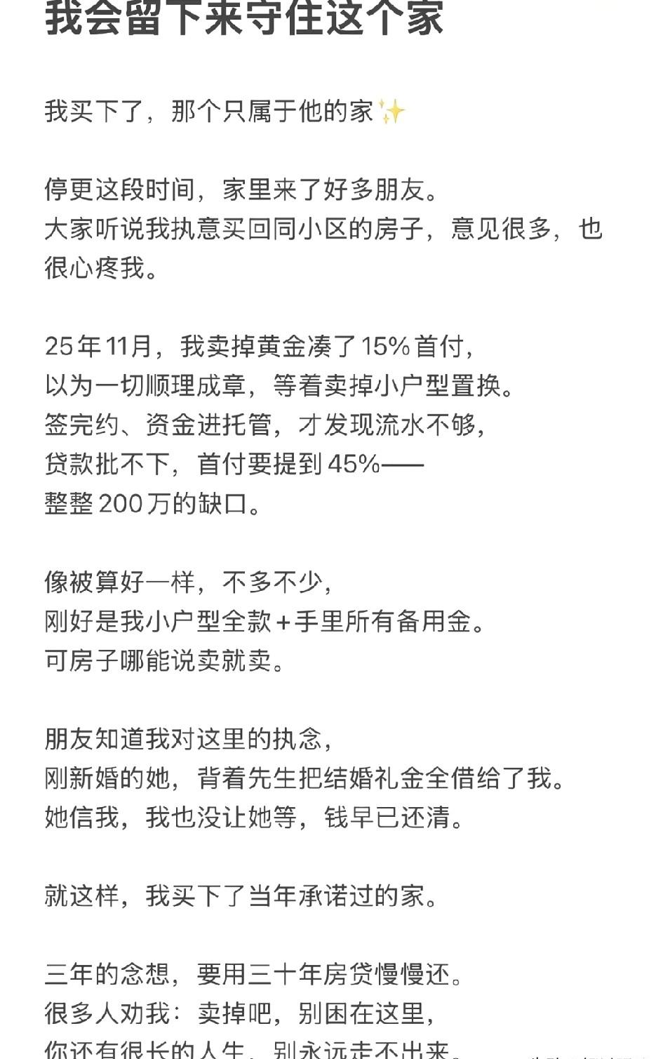 张雪峰前女友张张发声,称自己买下了属于张雪峰的家,这个房子是他们曾经同居过的小区大户型房,为了买这个房子她卖掉了张雪峰送她的小房子和黄金,还找朋友借了钱,还背了30年的贷款。 熟悉张雪峰的人都知道,他去世后,身边的相关人员要么沉默不语,要么低调行事,前妻清空动态一心陪女儿,现任也始终保持私密状态,唯有张张,选择直白地站出来,在社交平台袒露自己的心声。 她没有开通大号发声,而是清空了原来的账号,新建了一个名叫“张雪糕的家”的小号,头像用的还是张雪峰生前养过的小狗照片,细节里全是和过去相关的痕迹。 张张在小号里直言,自己买的这套房,就在她和张雪峰曾经一起同居的小区里,是一套大户型,面积不小,户型也十分规整,也是当年两人一起看中、一起租住的小区里,最心仪的一套房。 她说,那时候张雪峰还在忙着打拼事业,身上还背负着八位数的债务,两人一直过着租房的日子,看着这套心仪的大户型,只能默默憧憬,从来没机会真正拥有它,如今,她终于替两人完成了这个未完成的心愿。 很多人只看到她买下了这套房,却不知道,为了拿下这套房,张张付出的代价远比大家想象的要大,说倾尽所有也不为过。 她在发声时,没有过多修饰,直白地说了自己买房的整个过程,没有刻意卖惨,也没有渲染情绪,可每一句话,都让人听着格外有触动。 她坦言,买房的第一步,就是卖掉了张雪峰当年送她的那套小户型房子,那套房子虽然不大,却是张雪峰用心挑选的,承载着两人刚在一起时的甜蜜回忆,卖掉的时候,她没有丝毫犹豫,只想着能凑够买房的首付。 除此之外,她还卖掉了自己所有的黄金首饰,那些黄金有的是她自己攒钱买的,有的是张雪峰送她的礼物,每一件都有特殊的意义,可为了这套藏着两人回忆的大户型,她全都忍痛变现。 即便卖掉了小房子和黄金,凑到的钱依旧不够首付,银行审核时还告知她,流水不够,贷款批不下来,需要把首付比例从15%提高到45%,这一下子就多出了200万的资金缺口。 走投无路之下,张张只能找身边的朋友借钱,其中有一个刚结婚的朋友,二话不说就把自己收的礼金全部借给了她,这份情谊,也让她记在心里,后来也第一时间还清了这笔钱。 解决了首付的问题,张张又签下了30年的房贷合同,意味着接下来的三十年,她都要背着房贷过日子。 有人问她,明明已经和张雪峰分手,各自也有过新的感情,为什么还要花这么大代价,买一套和前任相关的房子,甚至背上半辈子的房贷,其实张张的话里,藏着一个早就埋下的心思。 她和张雪峰是在2021年3月认识的,那时候张雪峰已经离婚,拿着离婚证正大光明地追求她,恋爱一个月,张雪峰就向她求了婚,两人甚至连结婚登记照都拍好了。 只是那时候张张从小被亲生父母抛弃,有着严重的恐婚心理,再加上2022年家里有老人去世,按照习俗,三年内不能办喜事,两人的关系也慢慢疏远,最后和平分开。 张张坦言,分手后她找过新男友,其实是在和张雪峰赌气,并不是真心想要开始新的生活,她心里从来没有真正放下过这段感情。 更让她放不下的是,张雪峰一辈子忙着帮别人成家立业,帮无数考生规划未来,可他自己,却从来没有拥有过一套真正属于自己的房子,这成为了她心里的一个遗憾。 她还透露,自己早在2025年11月就定下了这套房,原本是想买下两人曾经一起租住的那一套,可原房主不肯卖,她就退而求其次,在同一个小区买了另一套大户型。 她说,这个小区里,有他们一起养过的狗“张雪糕”的痕迹,有他们一起熬过的夜,有他们三年相处的所有回忆,买下这套房,不是执念,而是想替张雪峰,守住一个真正属于他的家。 张张还提到,她和张雪峰的母亲关系很好,在张雪峰父亲生病期间,她还在医院端屎端尿悉心照顾,等张雪峰母亲处理完所有事务,她还会去看望老人,只是现在时机还不合适。 面对网友的劝说,让她放下过去、重新开始,她只是平静地回应,放不放下都已经没有意义了,她不想走出来,否则也不会执意买下这套房。 不同于其他相关人员的沉默,张张的发声,只是想单纯地袒露自己的心声,她不想利用张雪峰的流量走红,也不想博同情,只是想守住这份回忆,替张雪峰完成一个未竟的心愿。 3年的同居时光,换成30年的房贷,这份选择,无关对错,只是她对过去最真诚的告别,也是最长久的纪念。 不知道大家看完张张的做法,心里是怎么想的?你能理解她用三十年房贷,守护一段过往回忆的选择吗?你觉得她这样做,值得吗?欢迎在评论区说出你的观点。 信源:红星新闻:张雪峰前女友张张发声,倾尽所有买下曾经同居小区房产
