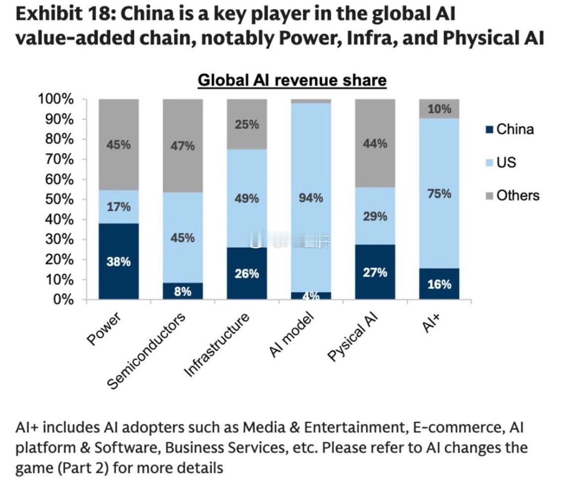 高盛(《中国观察:关于中东石油冲击的10点反思》中国在全球AI收入中占据优势的领域集中在硬件和基础设施层,分别占据AI电力(Power)38%、AI基础设施(Infrastructure)26%以及物理AI(Physical AI)27%的份额。 相较之下,美国在AI模型(94%)和AI+应用层(75%)占据绝对主导地位。女孩玩拼豆不幸触电离世
