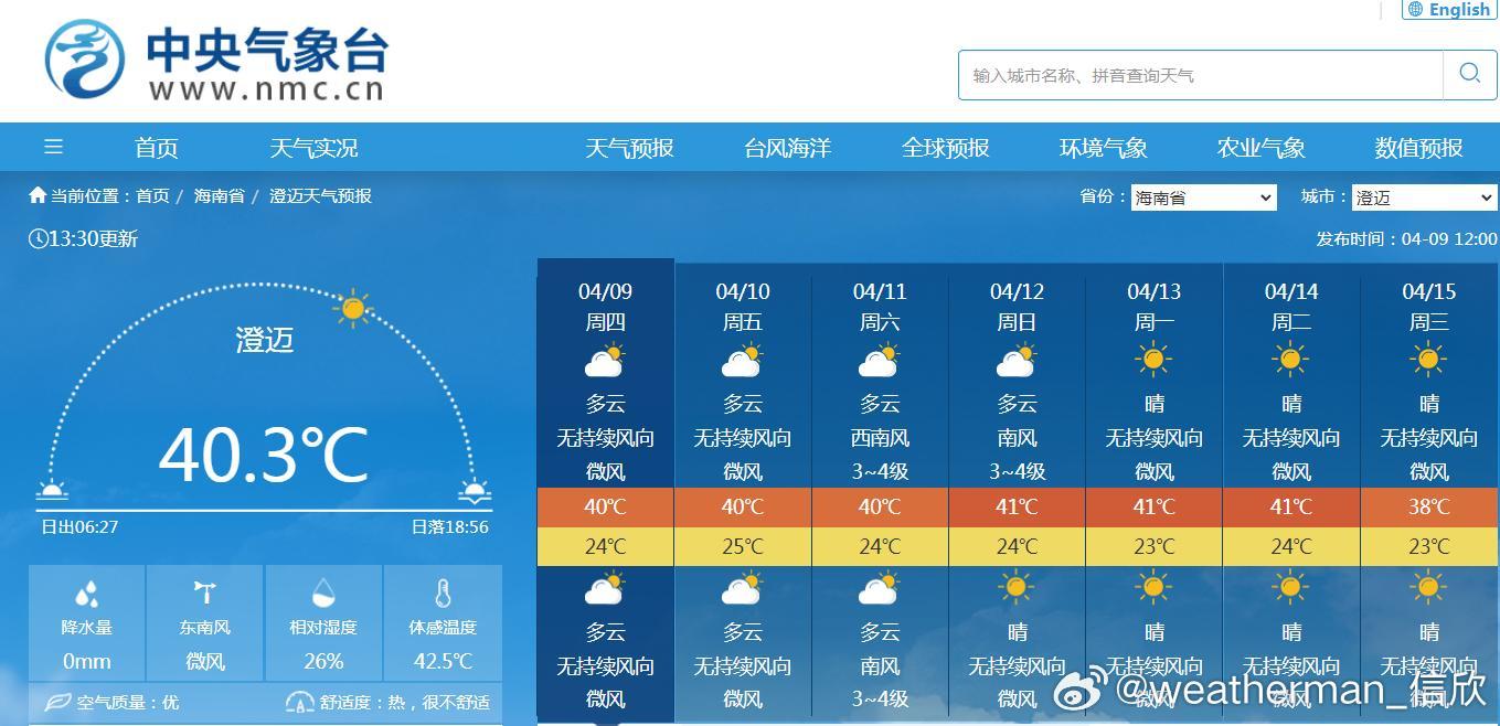 【海南澄迈连续40℃破纪录】今天午后澄迈气温再次冲上40℃,从4月6日-9日,连续4天上40℃,打破了当地观测史连续40℃日数的最长纪录(原纪录为3天,2020年5月6-8日)。而且未来澄迈可能还会达到40℃以上,纪录还会不断刷新。