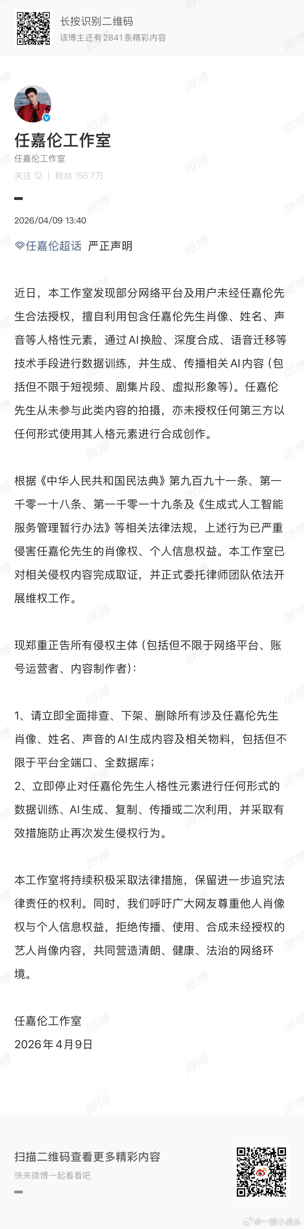 任嘉伦工作室发文抵制AI创作侵犯明星个人权益!抵制ai违法行为!