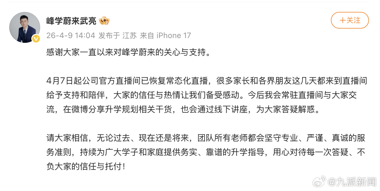 #峰学蔚来恢复常态化直播#【#峰学蔚来武亮发文#】4月9日,发文:感谢大家一直以来对峰学蔚来的关心与支持。