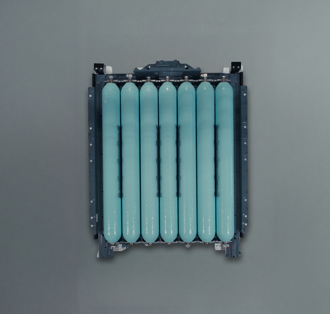 看看这几个大罐子挺喜感,先别笑,7个并联碳纤维高压储氢罐,700巴额定压力,集成金属框架并由中央主阀管控,确保安全可靠。可装载7kg以上氢气,加氢不到5分钟,WLTP续航最高750km,补能速度和加油一个水平线了。