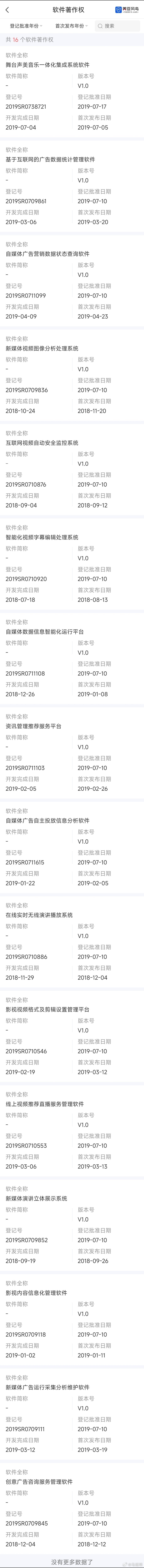 看看,这些版本号全是V1.0,没有任何一个软件有后续迭代版本(V2.0、V3.0),是不是可以说明这些软件从登记后就再也没有更新、维护、实际使用过,这算不算纯粹是为了拿证而做的“一次性产物”?