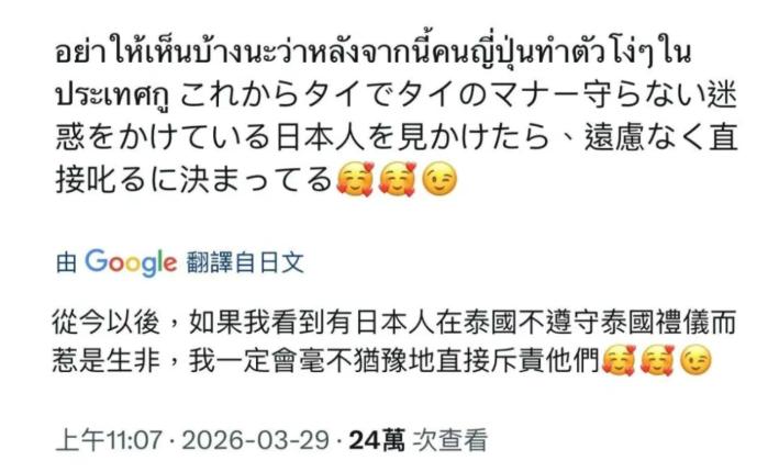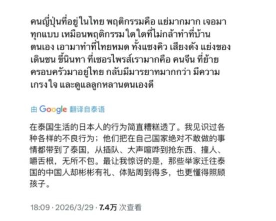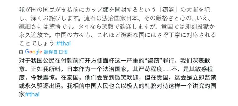 日本人现在遭到了全世界的讨厌。 起因是一名泰国游客在日本7-11买泡面,还没付钱就直接拆封了,泡上水后才拿去柜台结账。当时日本店员十分生气,说要先付钱,再拆封,这位泰国游客马上道了歉,说这种事情在泰国习以为常,他以为全世界一个样,没想到冒犯了,他感觉到抱歉。 视频里的场景很简单,一名泰国游客走进日本的7-11便利店,随手拿了一碗泡面,没等付钱就拆开包装,倒上热水,之后才端着泡好的泡面走向柜台结账。 日本店员见状立刻沉下脸,语气严厉地制止了他,强调必须先付款才能拆封。 泰国游客没有丝毫辩解,当场表达了歉意,解释说在自己的国家,这种先拆封再付款的做法十分普遍,他以为全世界都是这样,并非有意冒犯,随后顺利付了钱。 明眼人都能看出来,这就是一场单纯的文化差异引发的小误会。 日本因为担心顾客吃霸王餐,长期以来形成了先付款再开封的习惯;而泰国的社会信任度更高,人们习惯先确认商品无误再付款,先拆封泡面根本不算什么大事。 游客已经主动道歉,事情到此就该画上句号,可日本方面却偏要小题大做,把这场小误会当成了发泄情绪的出口。 熟悉日本现状的人都知道,这个国家的排外情绪已经积压了很久,尤其是网络上,右倾风气越来越严重,吐槽、贬低外国人已经成了一种常态。 更可笑的是,日本此前一直把中国游客当作发泄不满的对象,可随着中国游客大幅减少,他们没了宣泄的渠道,又不敢轻易招惹欧洲游客,只能把矛头对准了性格温和、看似好欺负的泰国人,典型的柿子专挑软的捏。 事件发酵的背后,离不开日本网红的推波助澜。 他们刻意剪辑视频,断章取义,把泰国游客的无心之失渲染成故意挑衅,还把视频发到网络上,煽动民众的情绪。 一时间,大量日本网友跟风转发,用上了各种低俗不堪的词汇辱骂泰国游客,甚至上升到对整个泰国和泰国民众的歧视,说泰国人没礼貌、没常识,甚至恶意抹黑泰国是不开化的地方,各种逆天言论层出不穷,更有极端网友叫嚣着要禁止泰国人入境。 原本这场骂战可能只会局限在小范围内,可恰逢埃隆·马斯克的X平台推出了自动翻译功能,各国网友不用借助翻译工具,就能直接看到对方的帖子,就连帖子里的语气和情绪都能完美还原。 这一下,日本网友的恶毒言论被泰国网友看得一清二楚,原本就憋着一股气的泰国网友彻底被激怒,纷纷用泰语直接回怼,一场跨国网络骂战就此爆发。 泰国网友的反击毫不客气,他们直言,一个小小的文化差异,日本竟然能上纲上线,足见这个国家的人缺乏基本的宽容之心,刻板、冷漠又虚伪,所谓的先付款再开封,不过是小家子气的臭规矩,恰恰体现了日本人对他人的不信任。 更解气的是,泰国网友还翻出了旧账,把日本游客在泰国的各种不良行为一一曝光,有性骚扰当地女性的,有在大海里裸奔的,还有闹事、盗窃、发酒疯的,每一件都有据可查,狠狠打了日本网友的脸。 此前就有4名日本男游客在泰国芭堤雅一家美容院骚扰女理发师,掀起对方裙子拍摄,事后日本网友还试图狡辩,说这几人不是真日本人,可泰国警方明确确认了4人的日本国籍,狠狠戳破了日本网友的谎言。 更让人不齿的是日本的双标行为。 有不少人猜测,当时日本店员之所以反应那么激烈,很可能是把泰国游客当成了中国人。 如今中日关系紧张,日本社会对中国人的歧视已经成了常态,仿佛歧视中国人是理所当然的事情。 可大家不妨想一想,如果做出同样行为的是美国人,那个日本店员还敢如此大声呵斥吗?答案不言而喻,他们只会忍气吞声,甚至可能还会笑脸相迎,这种区别对待,足以看出日本的虚伪和懦弱。 其实,日本之所以会如此歇斯底里,根源还是在他们自己身上。 这个国家已经经历了四十年的经济停滞,产业被周边国家逐步掏空,年轻人看不到未来,各种社会问题层出不穷。 可他们不敢正视自己的问题,无力解决这些根本困境,只能靠欺负外国游客这种小事发泄情绪,靠贬低别人来获取虚假的优越感,掩盖自己的无能和恐惧。 反观中国,同样是遇到类似的情况,做法却截然不同。 在中国,人们通常也会先付款再泡泡面,但如果真的有游客不小心先拆封了,店家绝不会像日本店员那样恶语相向,甚至不会有丝毫不满,大概率还会贴心地问一句,是否需要再加个茶叶蛋。 也正因为如此,泰国网友才会在骂战中由衷夸赞中国文化的包容,说去中国旅游从来不会受委屈,中国人总会尊重他们的习俗,这种包容和善意,正是日本所缺乏的。 马斯克在这场骂战中也意外“出圈”,他不断通过X平台为双方引流,看着两边互喷,活脱脱一个乐子人。 而了解他的人都知道,他早已把自己的母亲送到中国定居,这足以说明,他对中国的信任,远超对日本的认可。 这场由一碗泡面引发的风波,从来都不是简单的文化冲突,而是日本社会问题的集中爆发,也是日本被全世界讨厌的缩影。