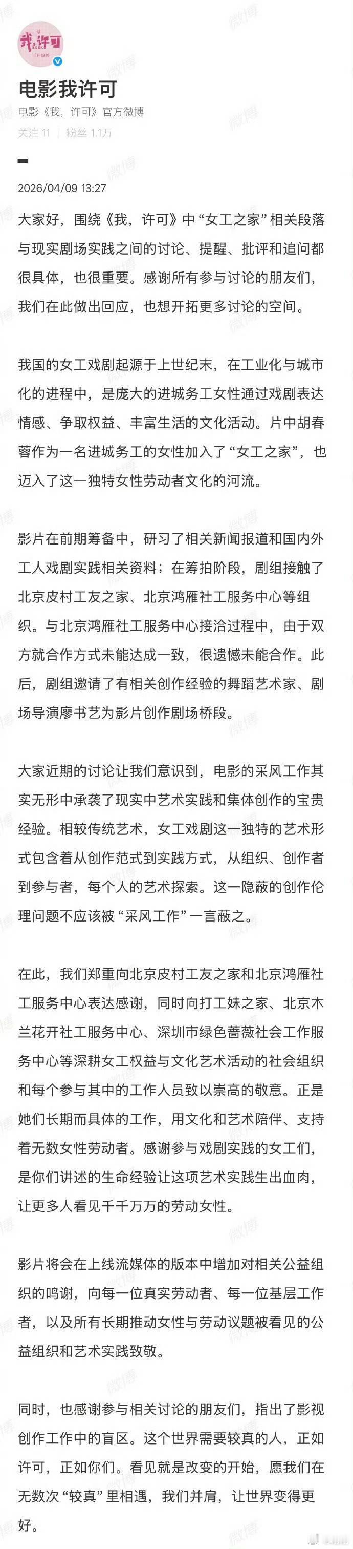 电影《我许可》被指侵权鸿雁社工的舞台剧《分身》,剧组回应称在筹拍阶段剧组接触了北京鸿雁社工服务中心等组织,最终没达成合作,邀请了其他人,承诺后续将会在上线流媒体的版本中增加对相关公益组织的鸣谢