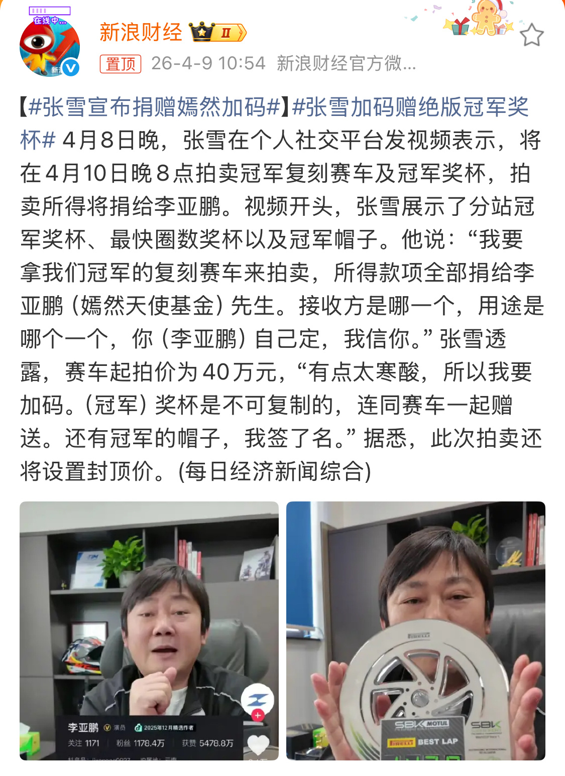 张雪宣布捐赠嫣然加码张雪还是太实在,现在感觉关注度在往下滑,这次冠军复刻赛车及冠军奖杯,大家觉得能拍出什么价?