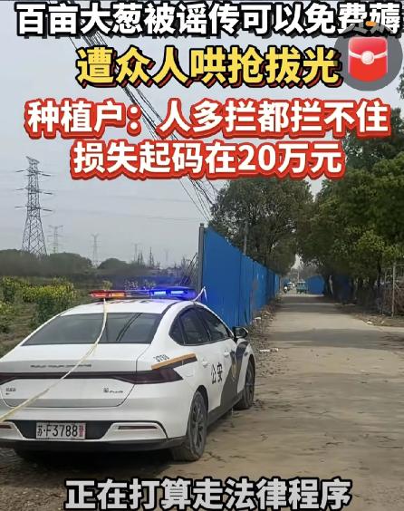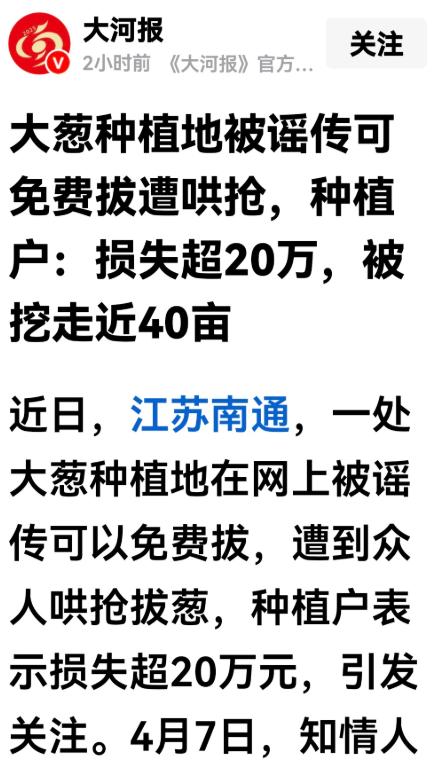 “江苏人这下不用嘲笑其他地方的人了,90亩大葱被抢,不能说拔葱的都是坐动车,坐飞机来的吧…”“真觉得老板能让你们免费薅吗?那是人家管不动了,才只能在旁边无力地看着你们薅”一一这是一个新闻下方评论区网友的留言。 说白了,别管你是哪个地方的人,碰到“免费”俩字,不少人的理智直接在线掉线,江苏这起90亩大葱被哄抢的闹剧,就是最真实的写照,以前总有人调侃其他地方有哄抢事件,现在轮到江苏人被打脸,谁也别笑谁。 事情发生在江苏南通海门的一处大葱地,据说这片葱地足足有90多亩,眼看就要到采收的时候,不知道是谁在网上发了条虚假视频,随口造谣说“这片大葱老板不要了,免费随便拔”,就这么一句没头没尾的话,居然掀起了一场哄抢热潮。 据说当时的场面特别混乱,有网友说,好几百人涌到地里,有的骑三轮车,有的拎着麻袋,甚至还有人专门带着锄头,不是拔几棵尝尝鲜,而是往抱不动了拔,更过分的是,有些人不光拔葱,还把葱根都刨了出来,说是这样更好带,把好好的葱地踩得一片狼藉,连田埂都塌了不少。 最让人揪心的就是种植户,眼睁睁看着自己辛辛苦苦种了大半年的大葱被人肆意薅走,却根本管不过来,我认为那种无力感,估计只有种地的人才能体会。 就像网友说的,真觉得老板能让你们免费薅吗?那是人家管不动了,才只能在旁边无力地看着你们薅,换做是谁,看着自己的心血被这样糟蹋,都会心疼到不行。 网上有两种声音吵得特别凶,一种说始作俑者必须全额赔偿,那些在网上无底线炒作、造谣的人必须入罪,必须让他们付出沉重的代价,这种歪风邪气真的到了非彻底治理不可的时候了,不然以后还会有更多人效仿,更多种植户受损失。 另一种声音说,其实拔葱没多大罪,既然有人说不要了,放在那里任其腐烂也是浪费,还不如让大家拔走吃了。 我倒觉得,哄抢和吃不吃葱真没啥关系,核心就是“免费”俩字在作祟,一听说免费了,管你大葱小葱,管你是不是别人的劳动成果,免费就是好葱,这就是很多人的真实心态。 别试着去解释什么,说这是造谣,说大葱是有主人的,当时现场那么乱,根本没人听,事实已经发生了,现在最该做的就是解决问题。 据说目前造谣者已经被抓到了,我认为这个发视频造谣的人就是罪魁祸首,所有的损失都该让他来承担,毕竟要是没有他的谣言,也不会有这场闹剧。 除此之外,那些参与哄抢的人也不能就这么算了,对周边哄抢的人员应该好好进行批评教育,让他们知道随便拿别人的东西是不对的,要是有不听劝告的,直接拘留也不为过,这样才能起到震慑作用。 之前也发生过类似的事,有地方谣传白菜免费、辣椒免费,最后都导致种植户损失惨重,可还是有人不长记性,一方面是造谣的成本太低,随口一说就能掀起风浪,另一方面也是有些人抱着“法不责众”的心态,觉得大家都在抢,自己抢一点也没事。 以上仅为个人看法,这起事件不光是一场简单的哄抢闹剧,更暴露了一些人的规则意识淡薄,也凸显了网络谣言的危害,造谣者的任性,哄抢者的贪婪,最终都让无辜的种植户买单。 希望这次能真正严惩造谣者,也能给那些爱占小便宜的人提个醒,天下没有免费的午餐,顺手牵羊的便宜,终究要付出代价。你们觉得,造谣者该全额赔偿吗?参与哄抢的人该不该被拘留?