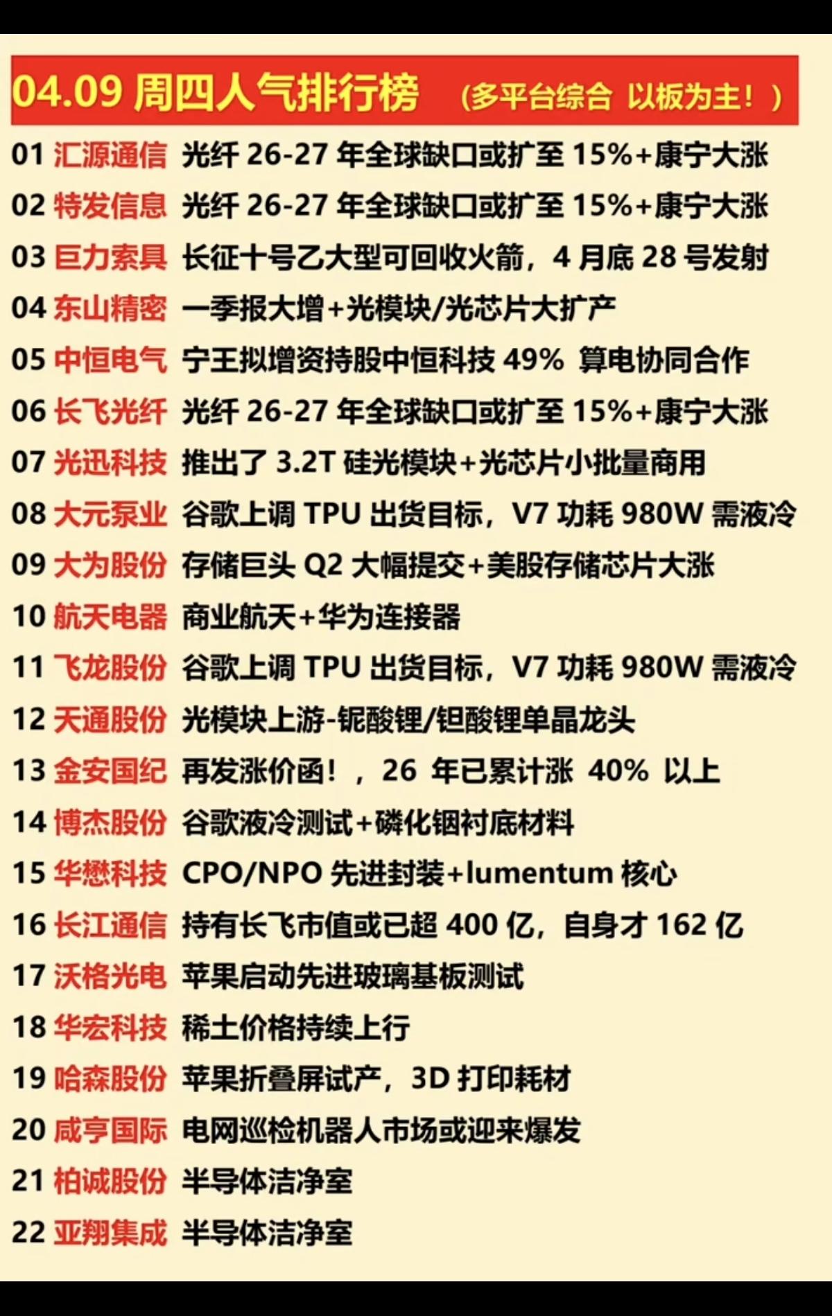 4.9周四 涨停板题材+人气龙虎榜! 1.光纤光缆涨价 2.光模块、光芯片 3.谷歌 4.苹果概念,柔性折叠屏 5.半导体洁净室