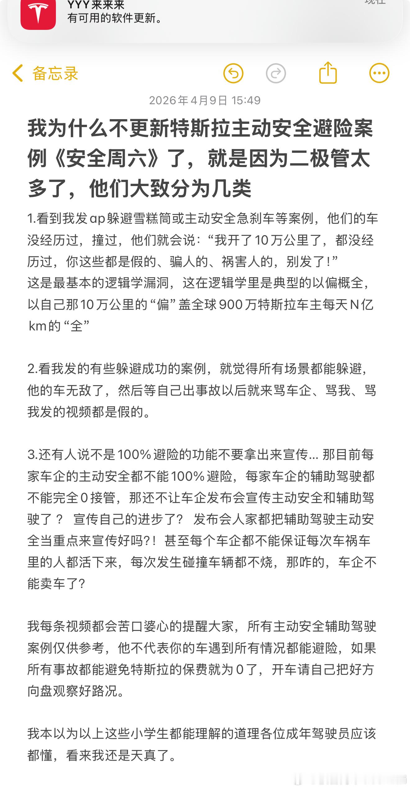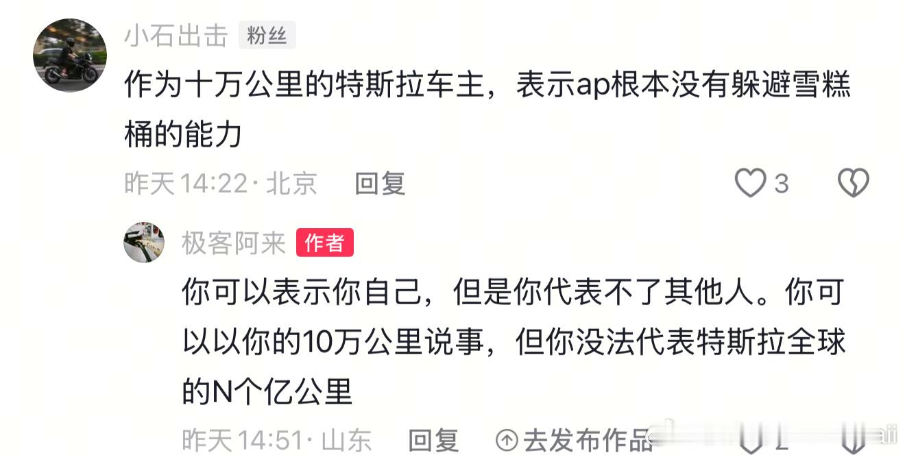 1.看到我发ap躲避雪糕筒或主动安全急刹车等案例,他们的车没经历过,撞过,他们就会说:“我开了10万公里了,都没经历过,你这些都是假的、骗人的、祸害人的,别发了!”这是最基本的逻辑学漏洞,这在逻辑学里是典型的以偏概全,以自己那10万公里的“偏”盖全球900万特斯拉车主每天N亿km的“全”