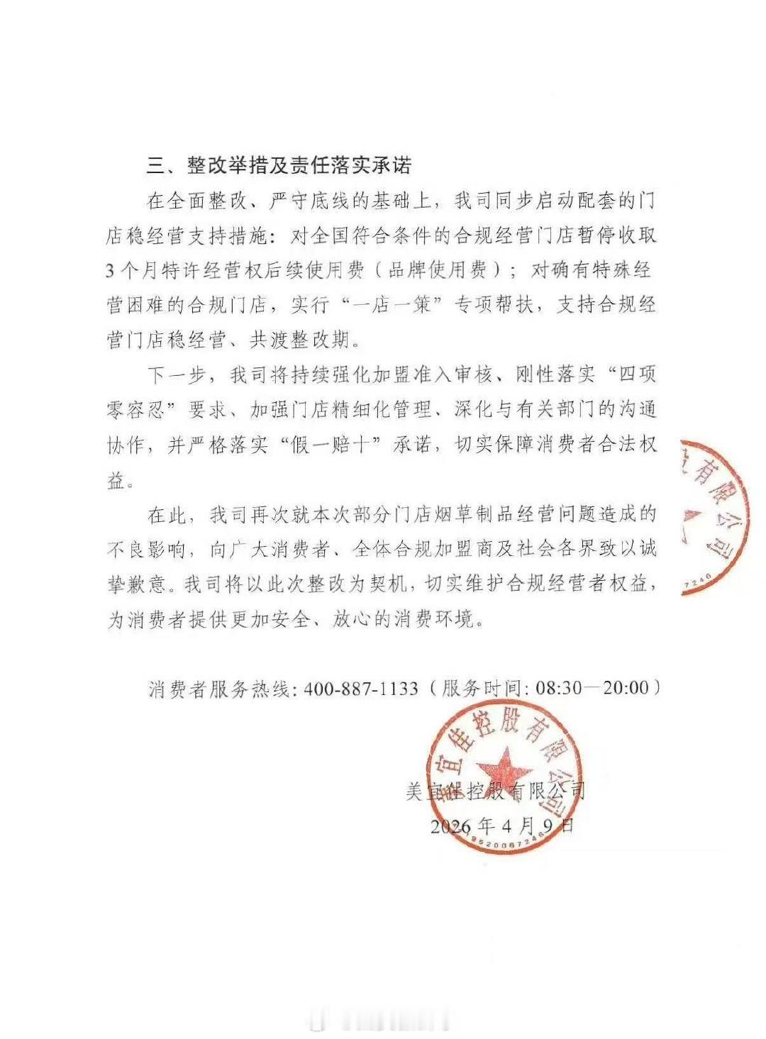 截至3月31日,我司已完成全国41061家门店首轮烟草制品经营专项排查,实现全覆盖。围绕“四项零容忍”要求,我司持续推进逐店核查、逐项整改,压实门店合规经营责任。目前,存续合规加盟店均已完成“四项零容忍”专项协议签署,承诺严格遵守国家烟草专卖相关法律法规及公司加盟合规管理规定。