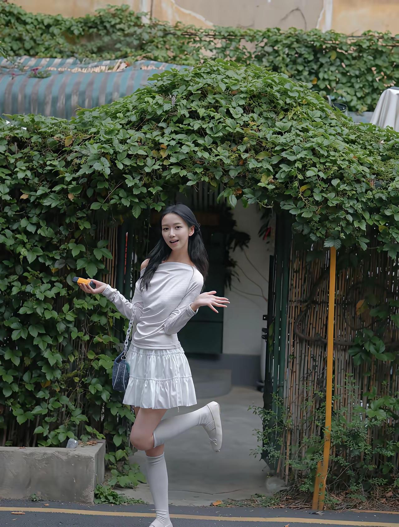 在古老的石墙前,黑衣少女静坐沉思,时光仿佛静止。