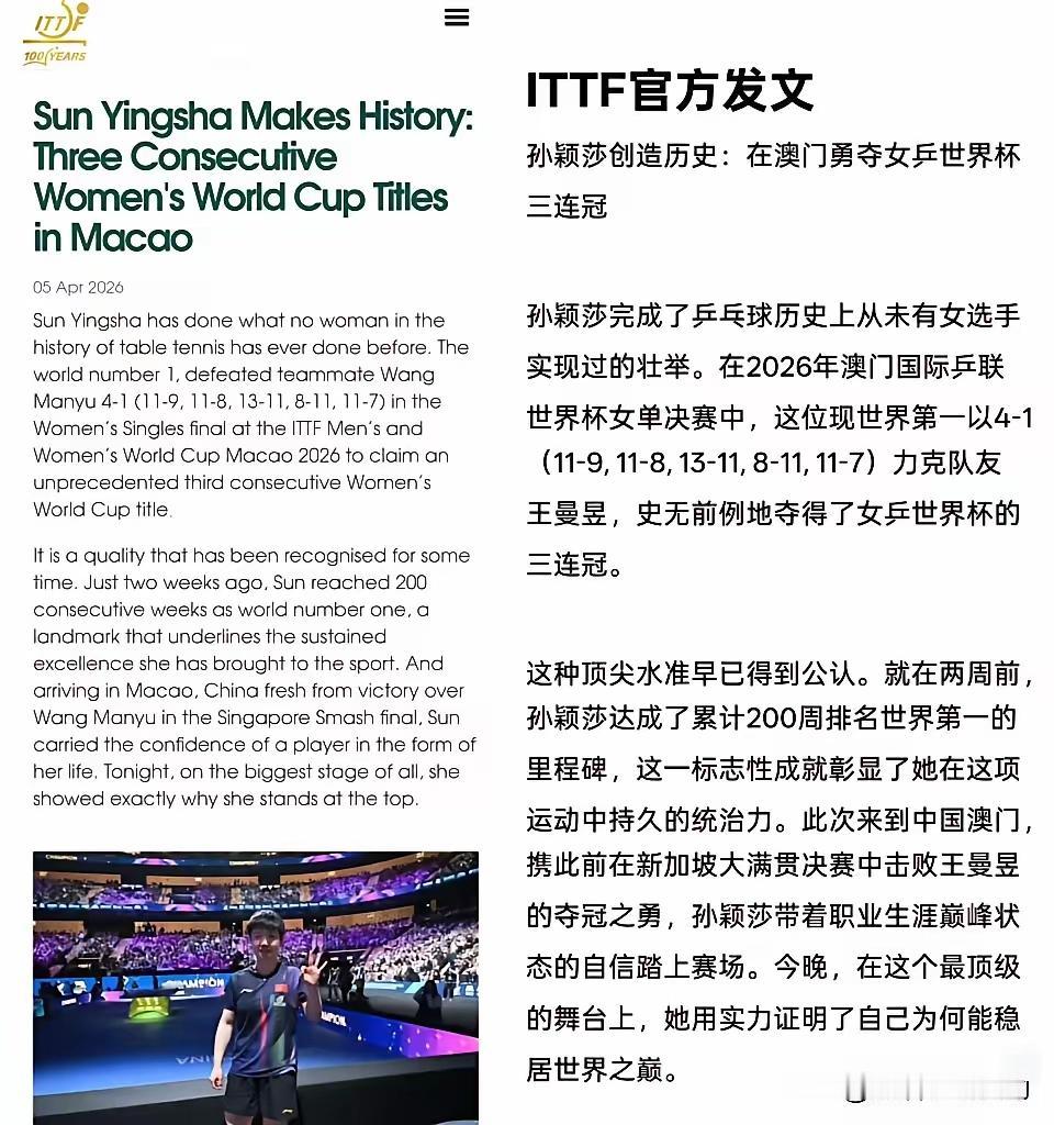 国际乒联发长文盛赞孙颖莎[烟花][烟花][烟花] 孙颖莎完成了“乒乓球历史上从未有女子选手实现过的壮举", 成为世界杯53年历史上首位女单三连冠得主。 高度评价孙颖莎: "在这个最大的舞台上,完美诠释了为何自己能屹立于世界之巅"。 文中还特意提到了孙颖莎和汉娜高达的比赛。 莎莎,自豪吧! 你的优秀,全世界都看到! 连续200多周,霸榜世界第一,也创造了历史。 莎莎,你若盛开,清风自来。越优秀 越幸运! 莎莎,国人为你骄傲!加油,下个赛场再见[点亮平安灯][给力][赞]