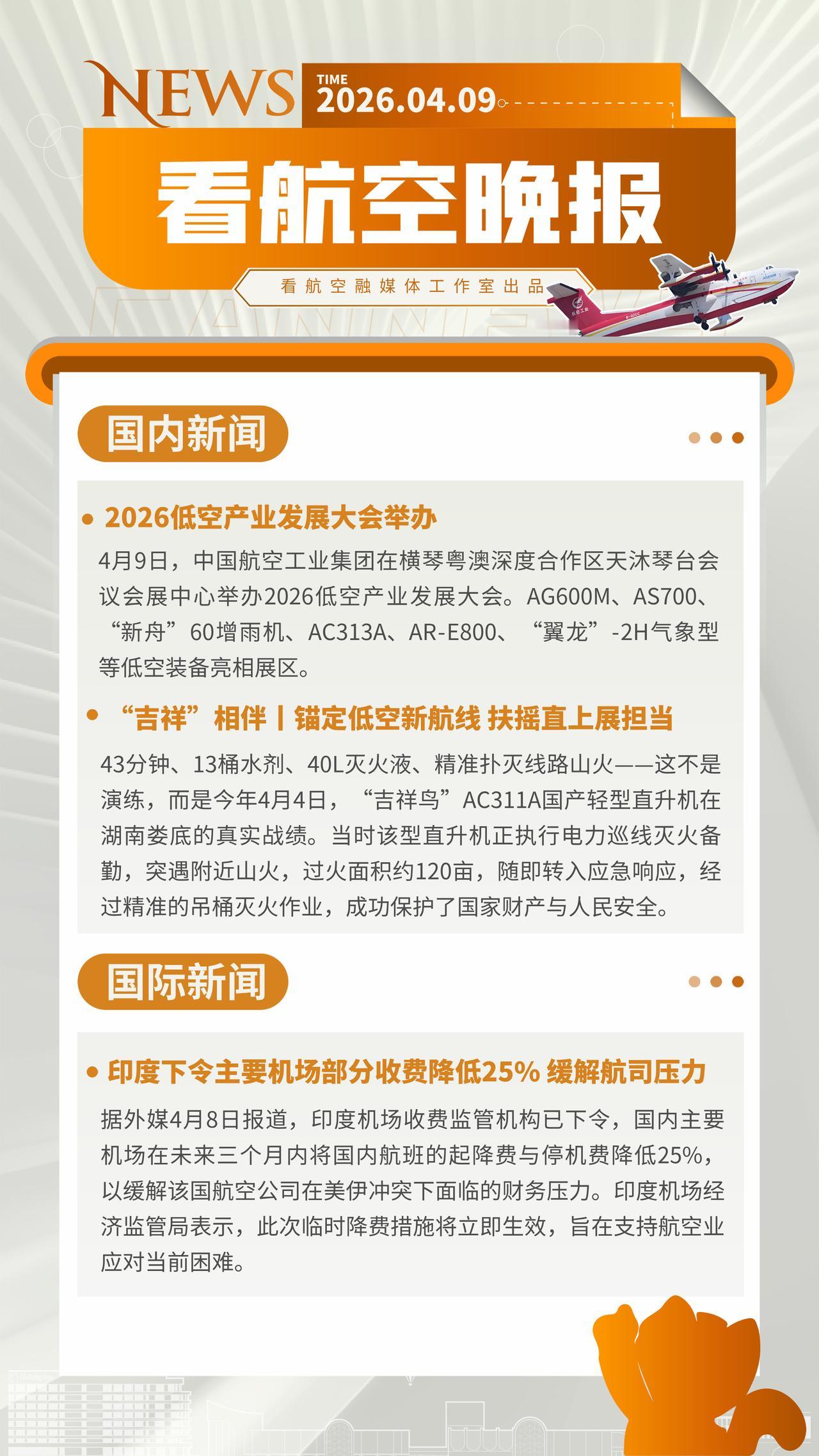 4.9晚报 2026低空产业发展大会举办 “吉祥”相伴丨锚定低空新航线 扶摇直上展担当 印度下令主要机场部分收费降低25% 缓解航司压力