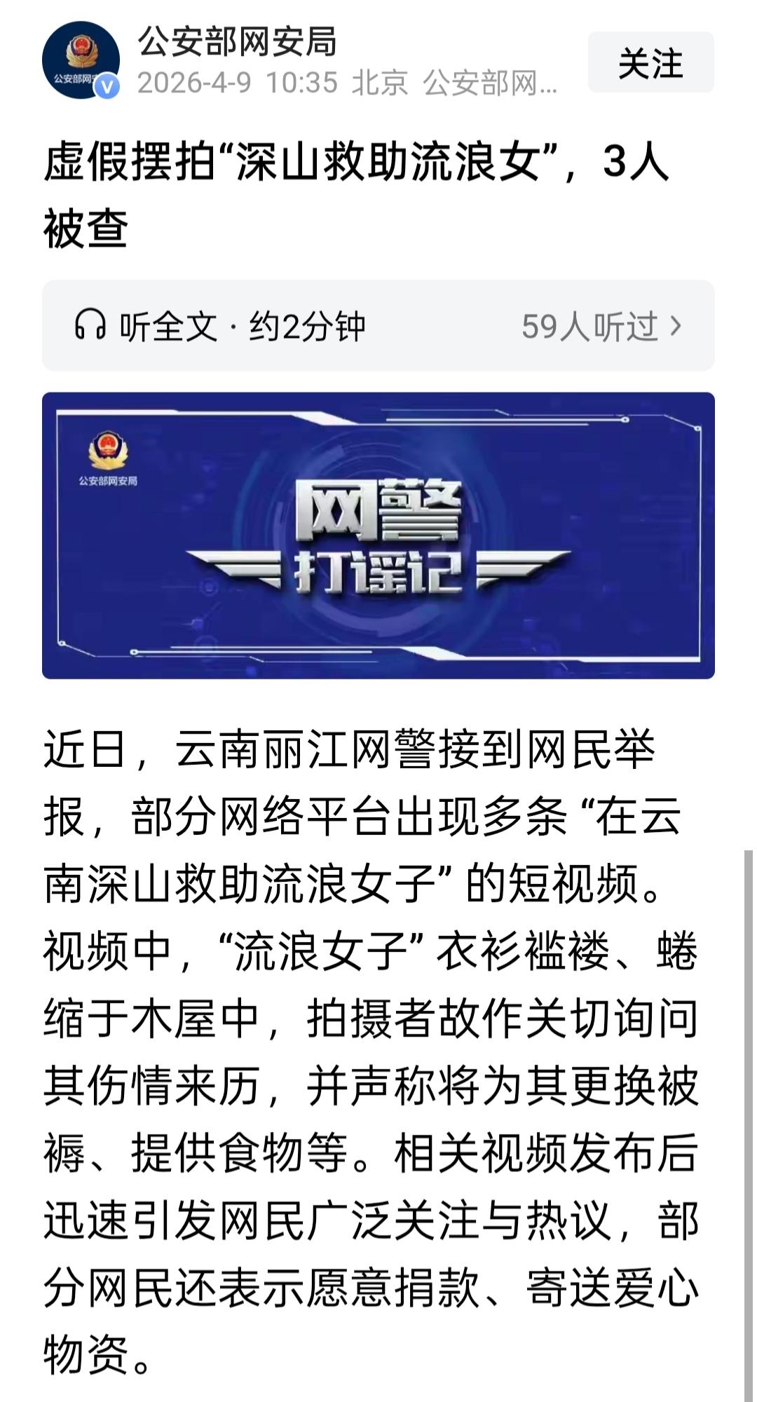 这年头看个短视频,我都怀疑自己是不是被骗进了片场。这演技,不去横店可惜了! 最近刷到那个“丽江深山流浪女”的视频没?一个姑娘衣衫褴褛,蜷缩在破木屋里,脸上黑一块灰一块,头发乱成鸡窝。 旁边一个“好心人”凑过来问:你咋了?从哪儿来的?然后说,别怕,我给你换被子、送吃的来。 好家伙,把我感动得差点就去翻钱包了!结果呢?公安部网安局一纸通报,直接给我整不会了,全!是!演!的! 事情的真相是这样的:刘某和阿某某为了博流量,专门从黑龙江跑到丽江深山,雇了杨某某来扮演“流浪女子”。 剧本都提前写好了,先假装“发现”,再假装“救助”,每一个动作、每一句话都是按脚本来的。从3月28日到被查,人家一共拍了十几条。 有网友直接评论:这演技不去横店跑龙套都可惜了! 细品一下这帮人的操作:特意跑那么远,找一个深山老林,故意把人打扮得脏兮兮的,脸上的灰都是特意抹上去的。这哪是什么“偶遇流浪女”啊,分明就是一场精心策划的“深山真人秀”。 更讽刺的是,他们演的还是“救助者”,假装自己善良,一边拍视频一边博同情。自己就是骗子,还要演“好心人”,这剧本写得我都想给编剧加个鸡腿。 关键是,真的有人信了啊!视频一出,评论区哭成一片,有人说要捐款,有人说要寄物资。幸好有网友举报,网警一查就露馅了。最后三人全被拘留:刘某和阿某某5天,杨某某2天。 要我说,这个拘留真不算重。要是真有人捐了款,那性质就变了,就不是拘留几天的事了。骗子再会演,也演不过法律。 最后说一句:各位网红,想火就去拍点正经内容,别天天琢磨这些歪门邪道。你们的演技好不好,观众心里都门儿清。 这回好了吧?3个人全部吃牢饭。赔了夫人又折兵,何必呢?