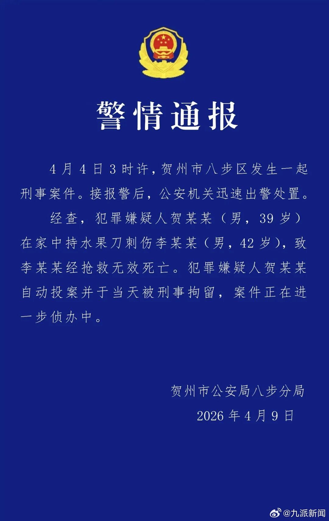 #男子凌晨在家中持刀刺死一男子#【#贺州警方通报一刑事案件致1死#】贺州市公安局八步分局4月9日通报:4月4日3时许,贺州市八步区发生一起刑事案件。接报警后,公安机关迅速出警处置。经查,犯罪嫌疑人贺某某(男,39岁)在家中持水果刀刺伤李某某(男,42岁),致李某某经抢救无效死亡。犯罪嫌疑人贺某某自动投案并于当天被刑事拘留,案件正在进一步侦办中。