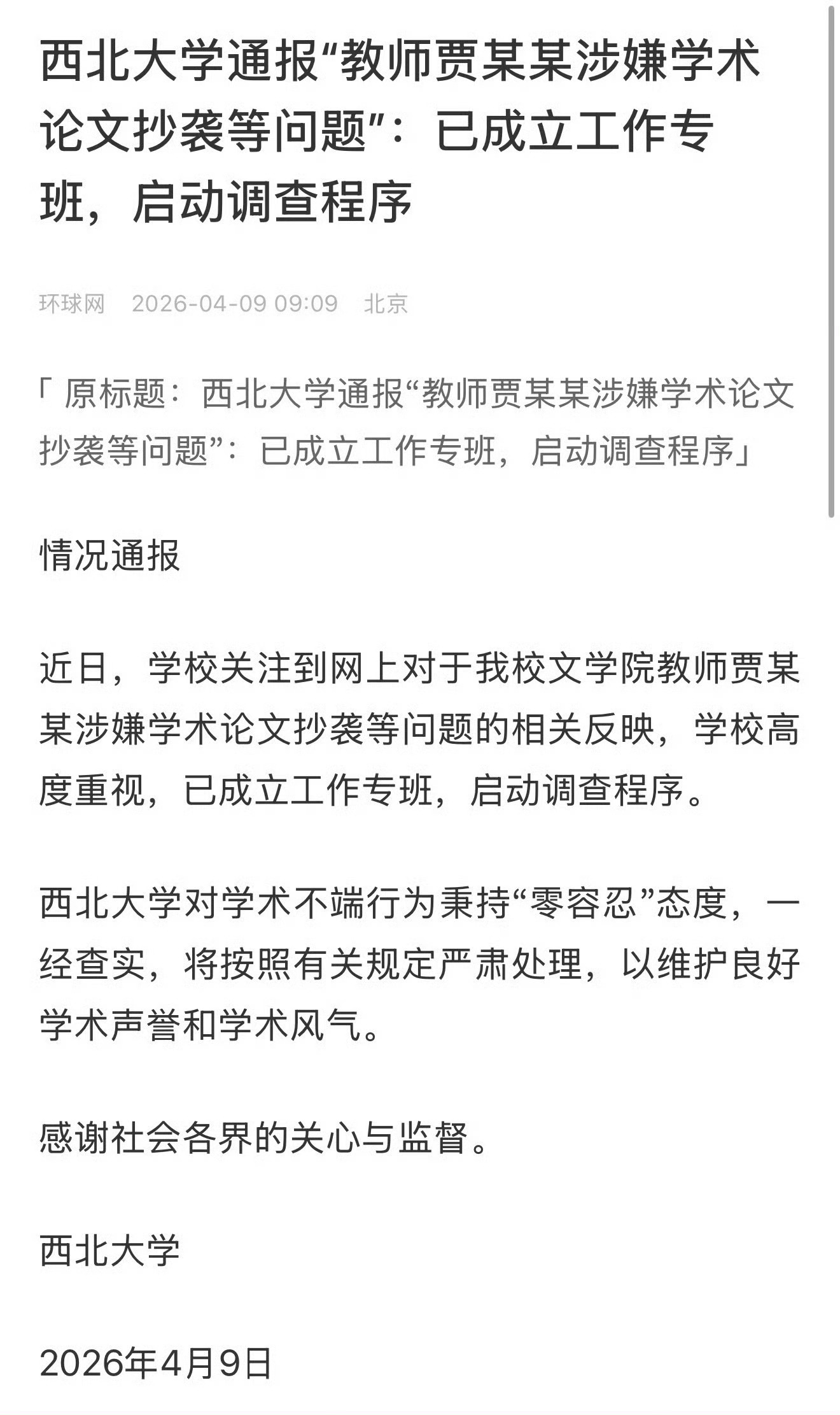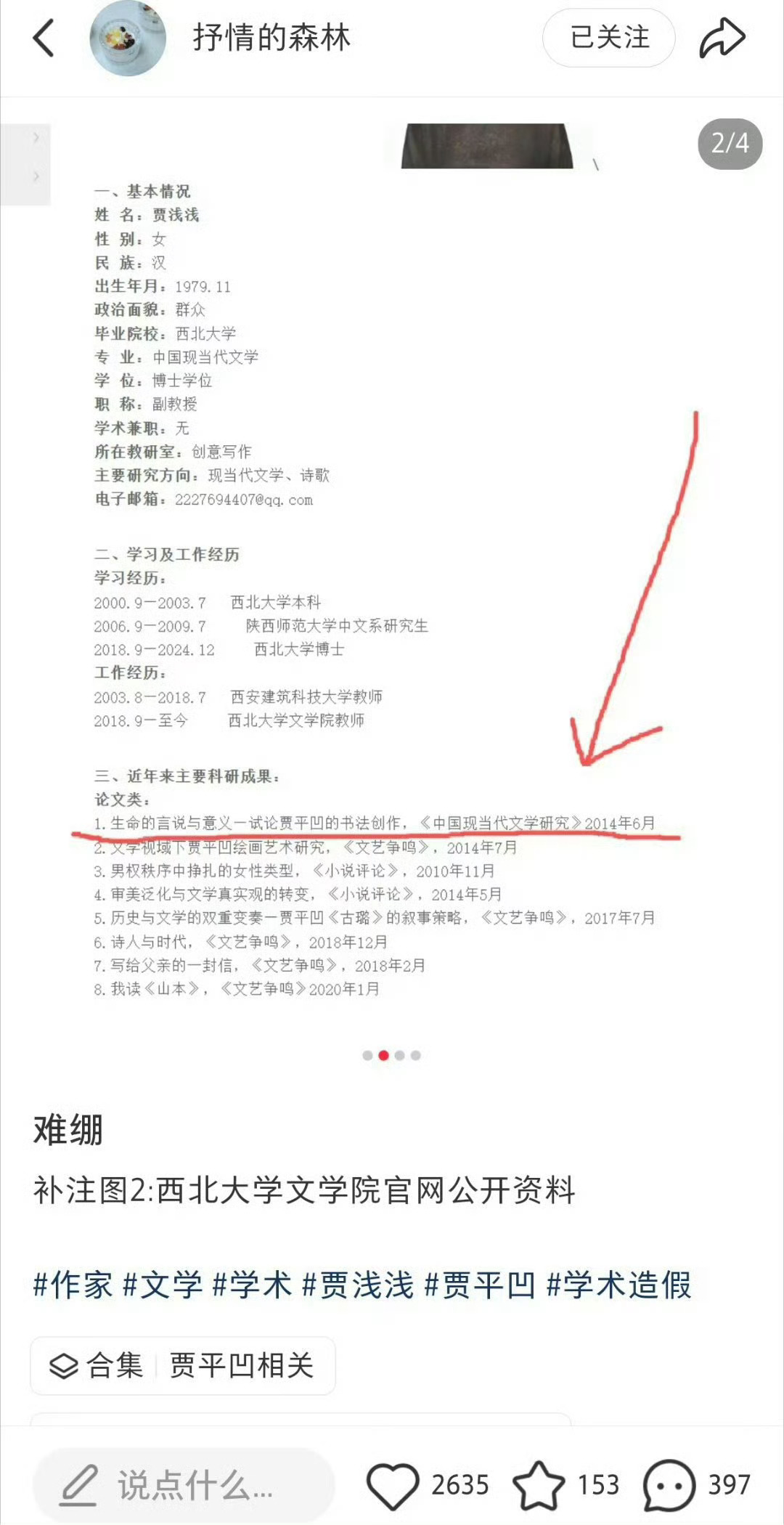 这种屎尿诗人就凭一个好老子,就能在大学里混?象牙塔里是真没少藏污纳垢!对网传贾某某论文抄袭等启动调查西北大学启动贾某某论文抄袭调查 【情况通报】 近日,学校关注到网上对于我校文学院教师贾某某涉嫌学术论文抄袭等问题的相关反映,学校高度重视,已成立工作专班,启动调查程序。