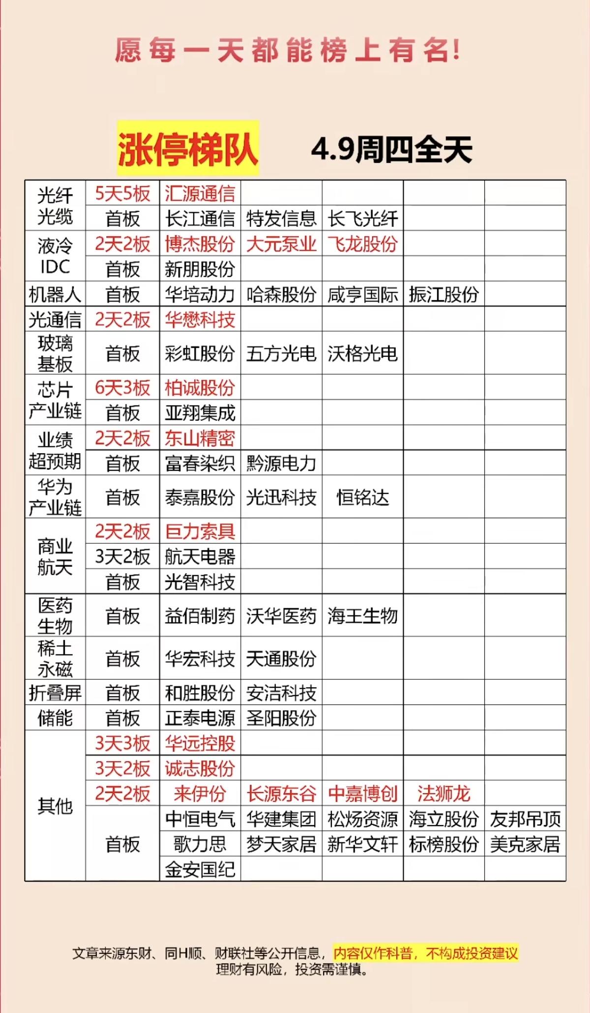 4.9周四 全天 涨停梯队! 光纤光缆 4股涨停 液冷IDC 4股涨停 机器人 4股涨停 医药生物 3股涨停 玻璃基板 3股涨停 芯片产业链 2股涨停